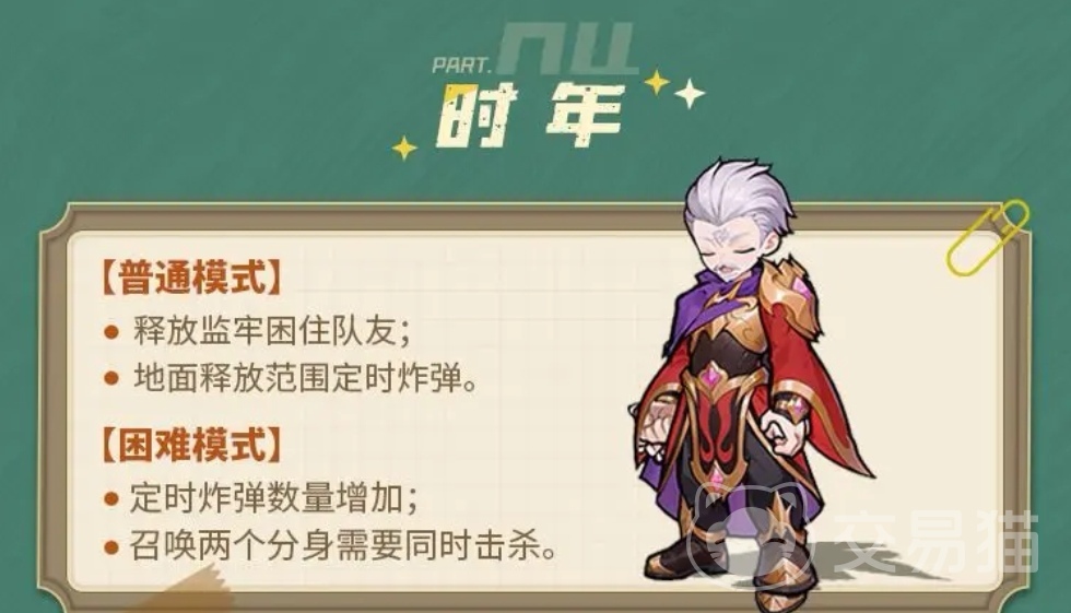 时年作为第四位Boss,具备强控场特性。普通难度下,他构筑单体禁锢牢狱并投掷多枚延时爆炸地雷;困难模式中,地雷数量增加且额外召唤两个分身协同作战。打法核心是:第一时间解除队友禁锢状态,困难模式需先将分身压至低血量,再利用AOE技能同步收割本体与残血分身。