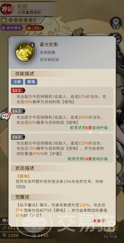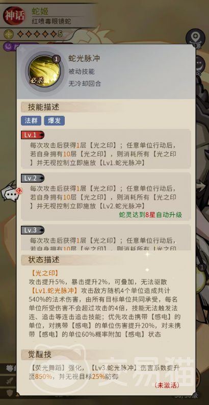 蛇姬的一技能“鎏光蛇影”为范围法术攻击,可对敌方中后排随机3名单位造成83%法术伤害,并有50%概率为目标施加【感电】状态。该状态使目标每回合额外承受施法者15%攻击力的生命流失,持续3回合,不可被驱散。觉醒后,该技能伤害提升至131%,【感电】触发概率提高至75%,同时为自身生成相当于本次伤害50%数值的护盾,显著增强其生存韧性与持续作战能力。