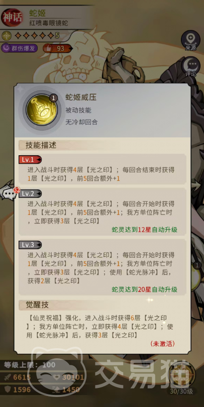 四技能“蛇姬威压”为核心资源生成被动。战斗开始时即赋予4层【光之印】;每回合结束再获得1层;前5回合结束时额外+1层。经仙灵祝福强化后,开局直接获得6层【光之印】;我方每阵亡1名单位,额外获得4层;每次释放“蛇光脉冲”后,再获得3层。该机制确保了【光之印】的稳定叠加节奏,是驱动蛇姬高频率释放必杀技的关键引擎。