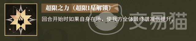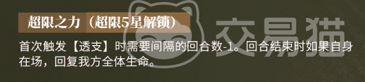 抵达超限五星阶段,角色功能性进一步跃升:触发“透支”技能所需的间隔回合数减少1回合,大幅提升关键辅助技能释放频率;回合结束时,只要其仍在场,即可为全队恢复一定比例生命值。该持续治疗能力与其防御定位形成闭环,显著增强队伍续航韧性。