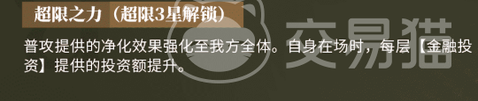 升至超限三星后,其普通攻击获得质变:净化效果由单体升级为全体队友,可即时清除多类负面状态,在高频施加DEBUFF的关卡中具有不可替代的战略价值;同时,其在场期间每层“金融投资”机制所生成的投资额同步提升,加快资源循环节奏。