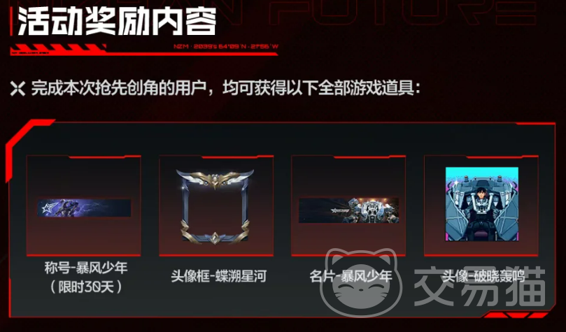 成功完成预创建的玩家,将在开服后即时获得四款限定外观道具:时效为30天的“暴风少年”称号;动态特效头像框“星渊星河”;专属社交展示组件“暴风少年名片”;以及高辨识度头像“破晓轰鸣”。所有奖励均为绑定账户,无需额外领取,上线即启用。