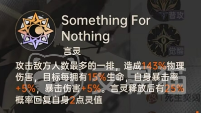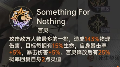 路明非的核心输出技能名为“Something for Nothing”,可对敌方中排单位发动高倍率物理伤害。该技能具备独特判定逻辑:目标当前生命值越高,暴击触发概率越高;且存在25%基础概率恢复2点灵值,显著优化技能循环节奏与资源管理效率。