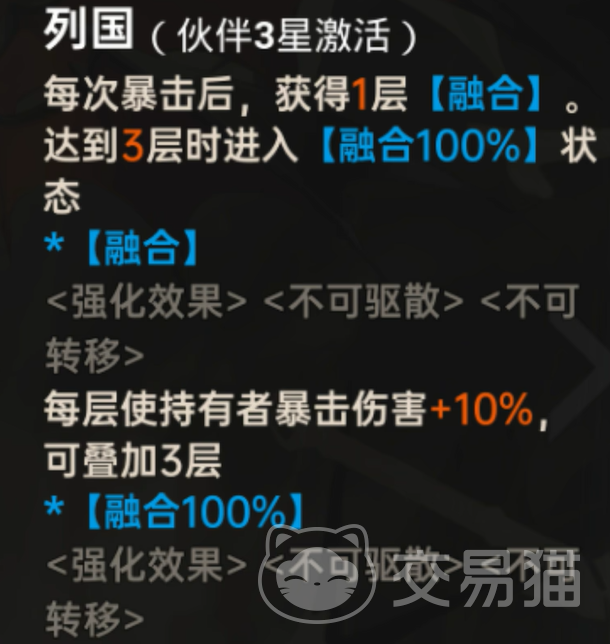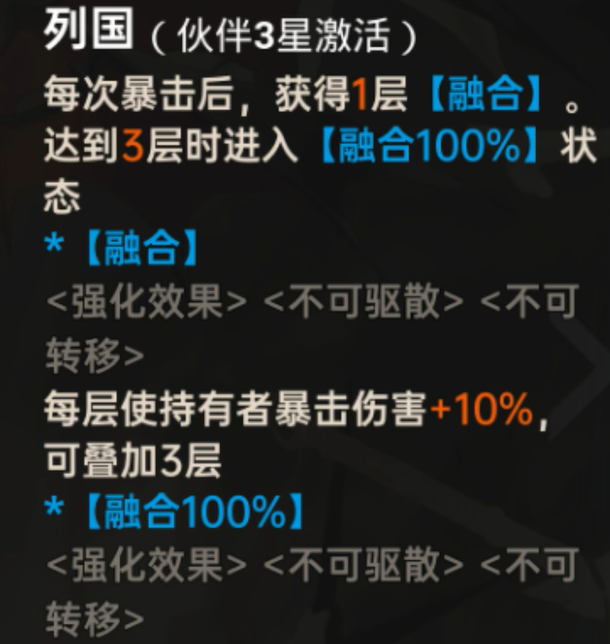 其特性系统随星级成长逐步解锁进阶能力。升至三星时激活“融合状态”,每触发一次暴击提升爆伤,累计四次达成100%融合度,同步提升暴击率,并使普攻附加基于自身最大生命值的额外物理伤害。五星满阶后,融合状态下暴击可触发吸血效果,并额外获得增伤buff,形成兼具持续输出与战场续航的复合型战斗模型。
