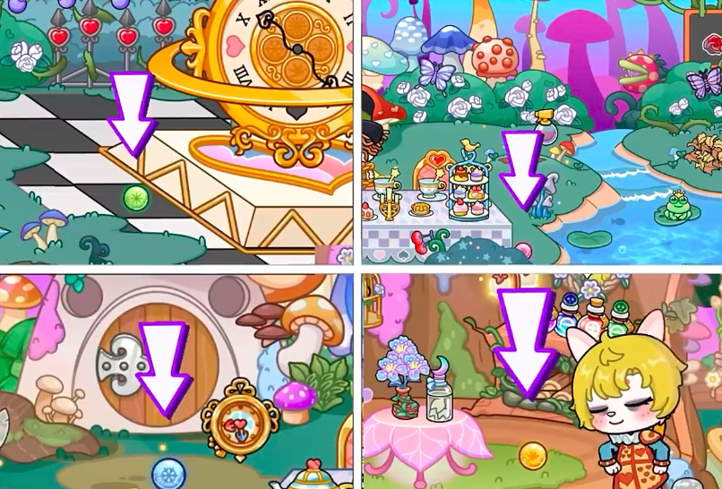 第三阶段:触发四季轮转。在以下四个固定坐标点拾取散落宝石:时钟左侧(绿色)、疯帽客甜品餐桌右侧(粉色)、密林小屋正门前方(蓝色)、密林小屋内粉色小桌旁(黄色)。共四颗,颜色与位置严格绑定。随后参照时钟中心浮雕图案的排列提示,将绿、粉、蓝、黄宝石依序嵌入指定插槽。完成嵌入后,时钟开始顺时针旋转,随即生成一把稀世宝剑,并保留此前拾取的护盾。