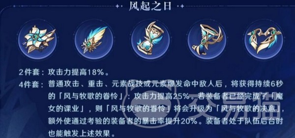 另一套「风起之日」则侧重于前台持续输出能力构建。2件套直接提升基础攻击力;4件套效果需通过攻击命中敌人触发,获得持续6秒的攻击力提升效果。若角色已达成「魔女的课业」成就条件,该效果将额外赋予暴击率加成,形成攻暴双增的复合收益。该机制对具备高频攻击、多段伤害或脱手技能的角色尤为友好,典型适配对象包括温蒂、可莉、杜林、菲谢尔等依赖普攻、重击或技能连段打出爆发节奏的角色。