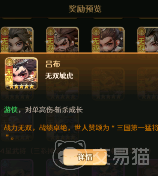 被动技【无双飞将】赋予吕布持续作战韧性:每当敌方有单位阵亡,吕布恢复自身8%最大生命值;且在触发该效果后,立即对当前生命值低于10%的敌方单位追加一次普攻。此外,每次普通攻击均可为其叠加15点攻击力与15点防御力,最高可叠加10层,显著提升中后期生存与输出稳定性。获取途径为求贤阁招募,因其泛用性强,常作为主力输出或战术核心参与组队。