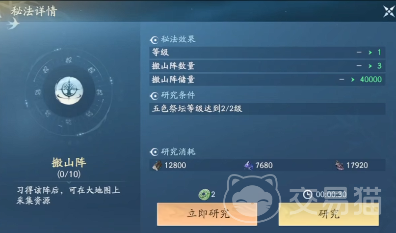 次选【搬山阵】——这是一项专精资源采集的被动型秘法。游戏中野外分布着大量矿脉、灵药圃、古遗迹等可交互资源点,基础采集效率受限于角色属性,难以满足中后期海量材料需求。搬山阵初始即提供可观采集加成,且支持升至10级;满级状态下,不仅采集速率跃升数倍,还可解锁稀有资源(如九窍玄铁、太阴寒髓)的采集权限,为炼器、炼丹及阵法升级提供稳定供给保障。