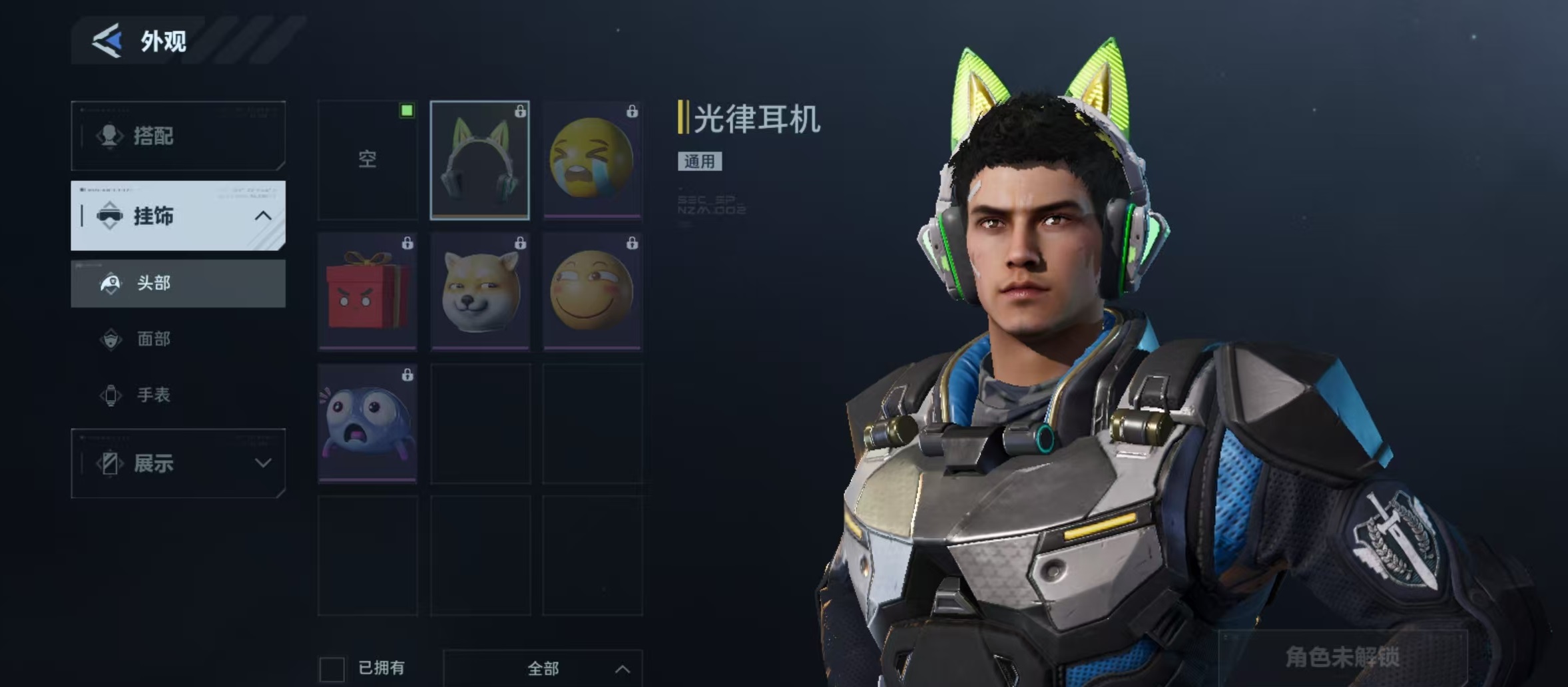 完成购买后,角色将即时解锁并同步至角色库。在预览界面中,玩家可对其外观进行多维度自定义:头部挂饰支持更换多种风格配件,包括光律耳机、滑稽头套、惊讶头套等;面部模块提供幻光护目镜、Z博士眼镜等不同面甲选项,每种组合均可实时预览效果。
