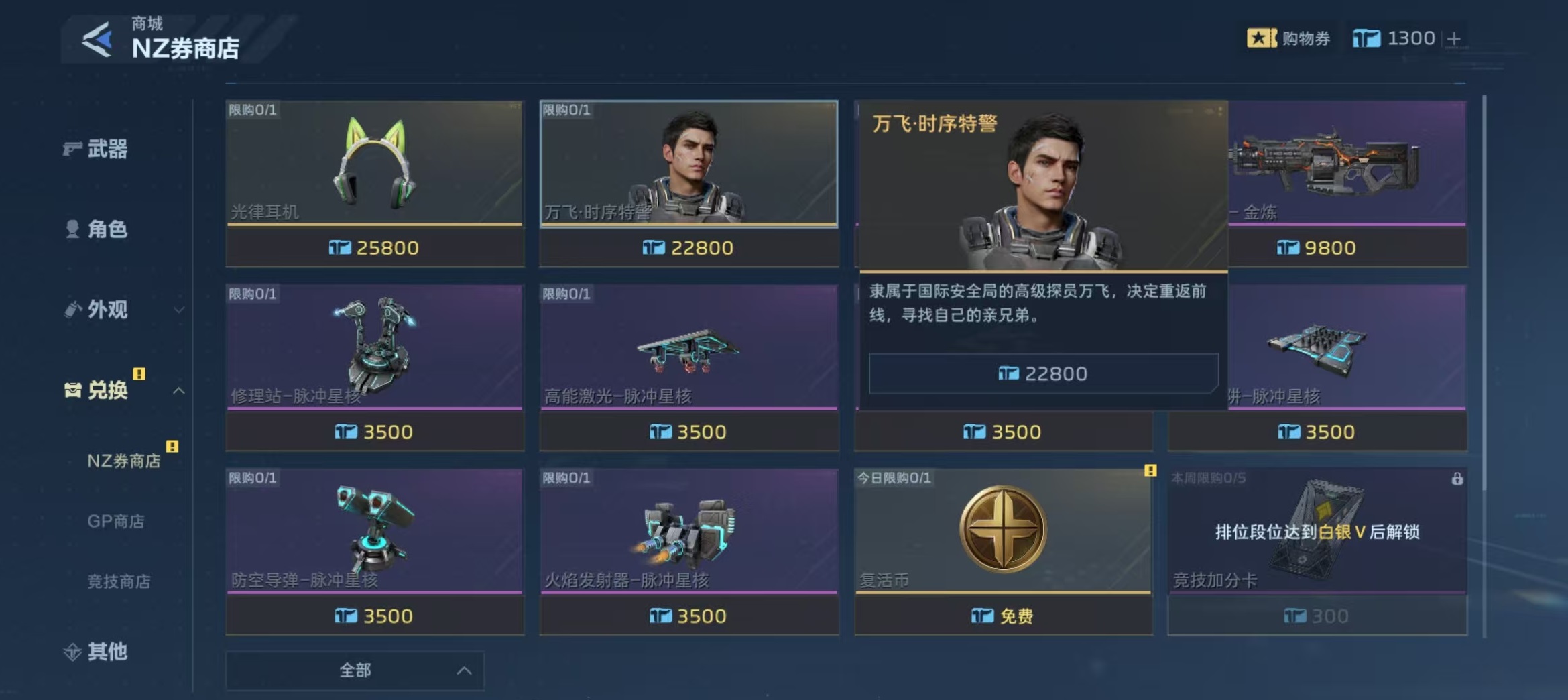 所有可操作角色均统一归入游戏内“角色库”系统,玩家可在主界面点击对应入口随时切换已拥有的角色。需注意的是,角色需先完成获取流程方可启用。万飞时序特警为直购型角色,无需通过抽卡或活动任务解锁。进入游戏商城后,切换至“NC券商店”分页,即可在显眼位置查看该角色的专属购买入口。每位账号限购一次,定价为22800点NC券。NC券可通过日常签到、PVE关卡通关、竞技模式段位奖励、限时挑战任务等多种免费途径累积,亦支持通过充值兑换获得。