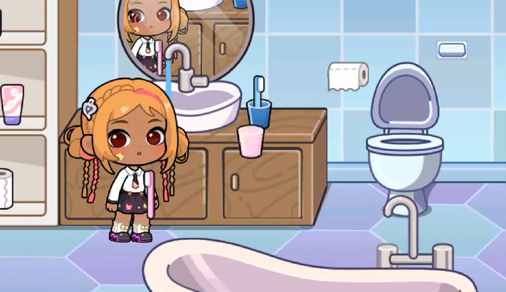 完成换装后进入晨间整理环节。进入卫生间场景后,点击牙刷道具并指向角色,系统将自动执行刷牙动作;随后拖动毛巾至角色面部,即可完成基础清洁流程。全部准备就绪后,角色将搭乘专属校车前往校园。