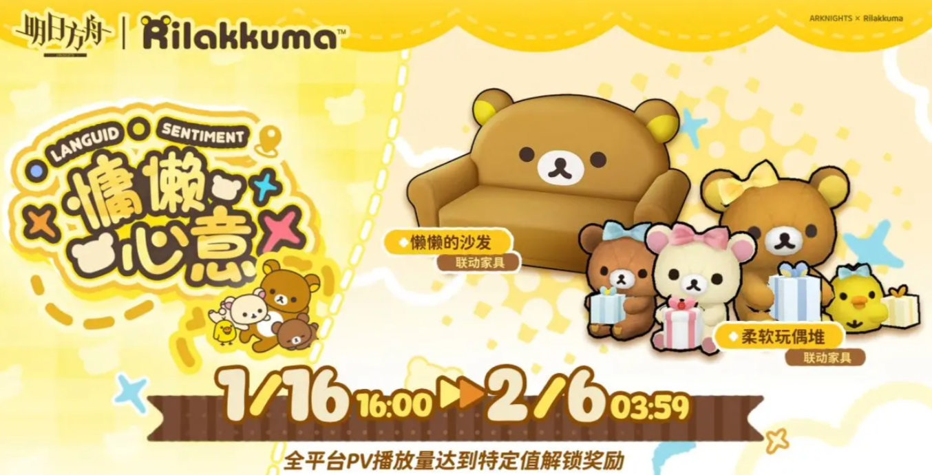 活动期间,全平台累计PV达成指定目标后,将依次解锁三款联动家具:慵懒的沙发、柔软玩偶堆、养成素材。完成解锁并布置于基建中后,玩家可在该场景中享受片刻休憩时光,沉浸式体验轻松小熊所传递的舒缓氛围。