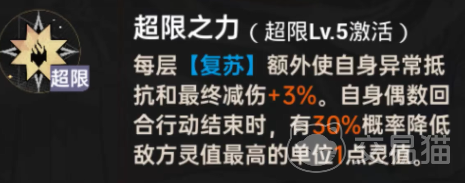 进入超限状态后,康斯坦丁的压制维度全面升级:灵值削减目标上限提升至3名;只要存活,敌方言灵攻击最终伤害恒定降低10%;每层【复苏】额外提供3%异常抵抗与最终减伤,大幅优化生存容错率。整套机制环环相扣,形成“削弱—反制—续航”的稳固闭环,在中后期高难度副本及PVP长线对抗中表现极为稳定。