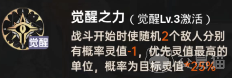觉醒机制进一步强化控场能力:1星觉醒使言灵对灵值≥4的目标降低灵值概率提升至45%;3星觉醒可在战斗初始阶段,按25%×目标当前灵值的概率,随机选取2名灵值最高者削减1点灵值;5星觉醒于偶数回合结束时30%概率对全体施加攻击下降,并在施加任意负面效果时额外+1层效果层数。
