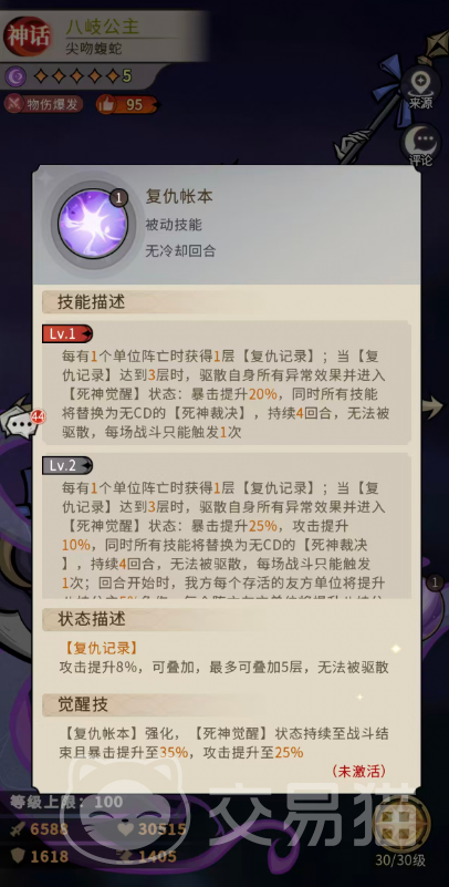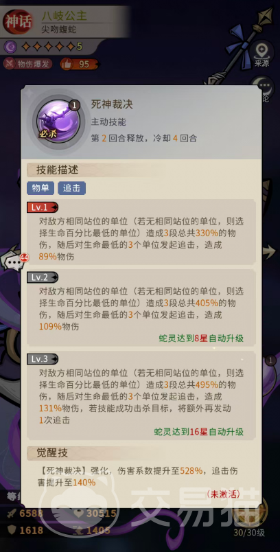终极被动【复仇帐本】定义其战略价值:场上每有1个单位阵亡,八岐公主获得1层“复仇记录”;叠满3层时,立即驱散全部异常状态,并进入持续4回合的【死神觉醒】状态——暴击率提升20%(觉醒后为25%),攻击力提升10%,所有技能替换为无冷却的【死神裁决】。此外,回合开始时,每名我方存活单位为其提供5%免伤,每名我方阵亡单位为其提供5%伤害加成。该机制使其在中后期团战中具备极强的容错性与翻盘潜力。