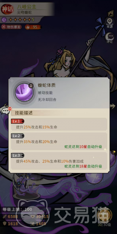 被动技能【蝮蛇体质】提供稳定属性成长:初始提供25%攻击与15%生命加成;10星升级为35%攻击+20%生命;18星(三级)最终形态为45%攻击+25%生命+10%伤害加成,构成持续作战的生存与输出基底。