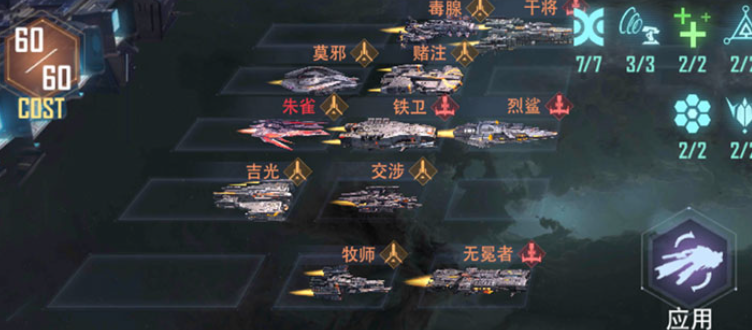 第一套体系以第七军团为战术支点,主打群体压制与持续输出循环。前排配置搭载“不灭舰队”特性的战列舰,可在首次生命值低于30%时恢复50%最大生命,并降低20%持续伤害。后排星舰依托“狩猎时刻”与“战地主宰”双重增益,在释放集气技能后可直接摧毁目标;该效果触发时同步返还能量,并叠加伤害提升与暴击效率,形成高效输出链。初期资源受限阶段,建议以交涉护卫舰替代巨象与穷奇,确保cost分配合理,保障核心技能释放频率。