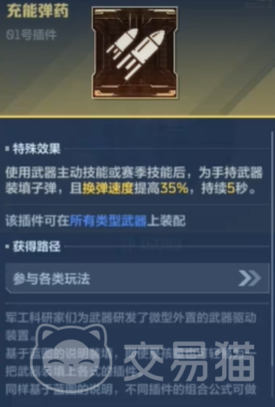 “充能弹药”插件具备极高的战术普适性。其核心效果为显著缩短换弹时间,在实战中可有效规避因换弹空档被压制或击杀的风险。尤其适配弹匣容量偏低的武器(如部分冲锋枪与手枪),换弹效率提升后,持续交火节奏更连贯。该插件在PVE清怪与PVP对枪场景中均表现稳定,是新手过渡期与高手速配方案中的首选基础项。