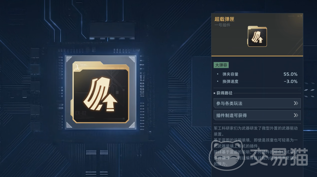 武器性能释放高度依赖插件协同。在1号插件槽位,推荐装配过载弹夹或超载弹夹——二者均提供弹匣容量提升,配合角色技能“多重装填”,可大幅压缩换弹间隔,实现长时间无断点火力覆盖。该配置在应对集群敌人、BOSS战多阶段切换或狭窄地形遭遇战中尤为关键,有效规避因装填动作导致的输出真空期。