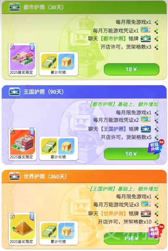 月卡是当前性价比突出的长期投入选项。购买后可稳定领取限免游戏资格、基础货币、每日折扣券,并依据所持护照等级解锁对应经营权限。该服务按自然月计费,到期后支持续订季卡或年卡以延续权益。