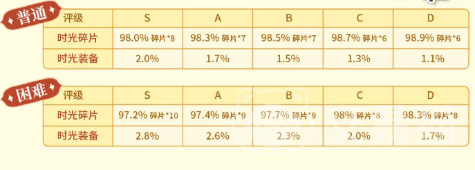 该副本采用时间操控机制为核心玩法逻辑。玩家需在限定时间内尽可能收集积分,而钟楼内部的时间流速由发条装置调控——通过旋转扭转发条,可实现局部时间回溯,重置部分机关状态。关卡提供普通与困难两种难度选项,不同难度下碎片与装备的掉落概率存在差异,具体数值分布详见下方说明图示。