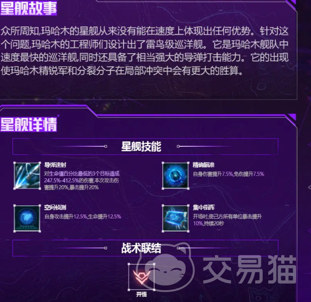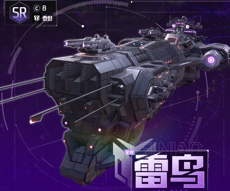 第三艘为“雷鸟”泰坦战舰。此类舰种普遍体型庞大,而“雷鸟”在保持高吨位的同时具备突出的机动性能。其首项技能“导弹射速”锁定当前生命值最低的3名敌方单位发动攻击,并额外提升本次伤害与暴击率各20%;第二技能可同步提升自身伤害与免伤7.5%;第三技能“空间侦测”使攻击与生命值均提升12.5%;终极辅助技可在战斗开场时,为全体友方单位提供持续20秒、幅度达10%的暴击率加成。