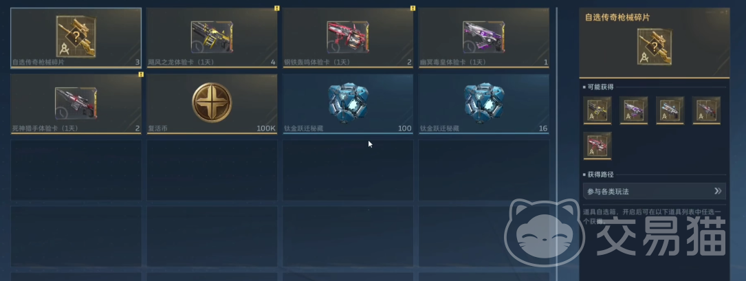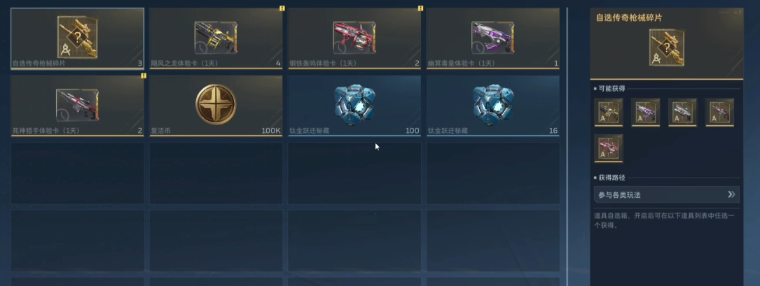 开启传说钛金跃迁秘藏后,奖励池涵盖金色武器、紫色武器及近战类新装具,同步适配“钢铁起源”版本新增装备体系。根据当前掉落算法,紫色武器出率相对稳定,金色武器属高价值稀有掉落,虽存在随机性,但亦有概率获得金色武器体验卡(有效期1日)。若未命中主武器,则可能获得各类功能性挂件,用于角色外观定制。