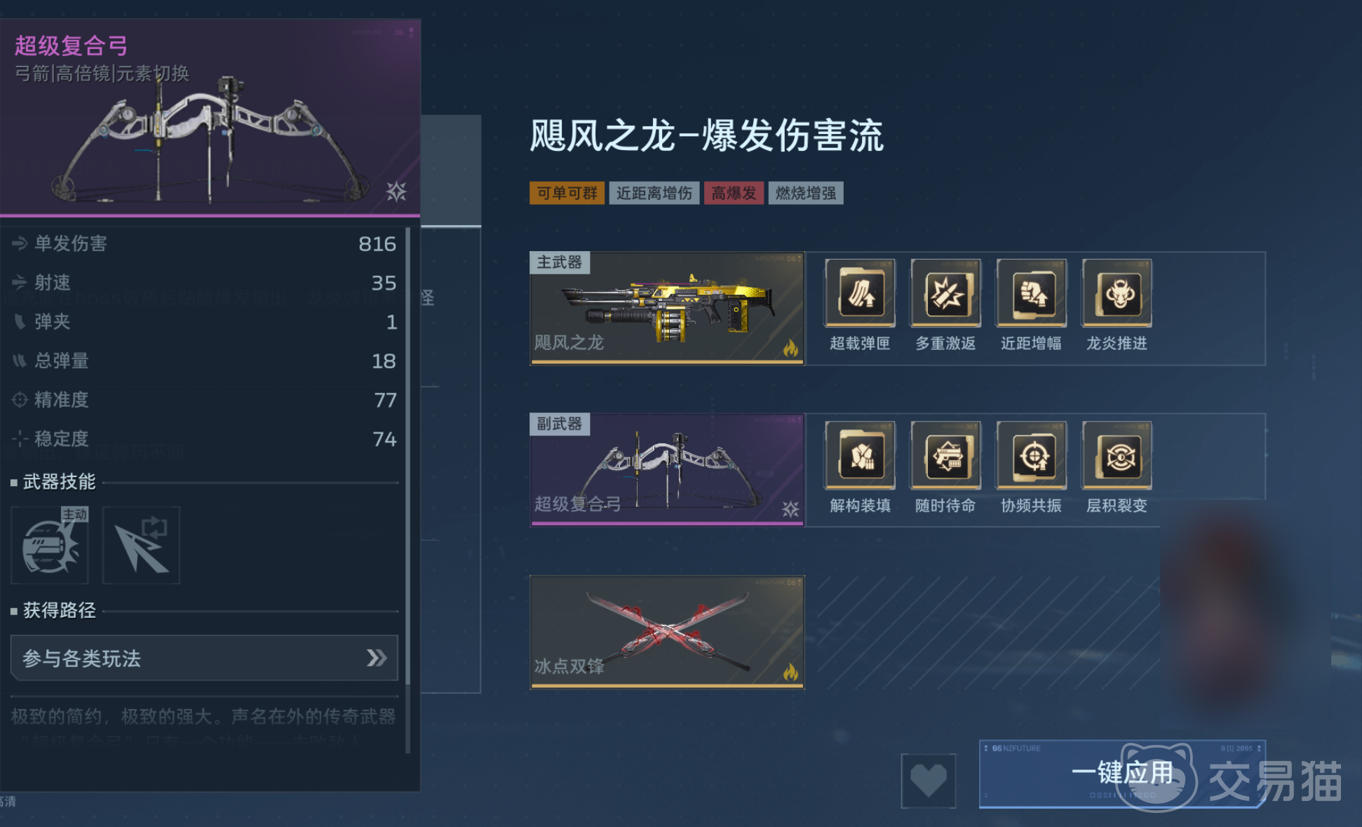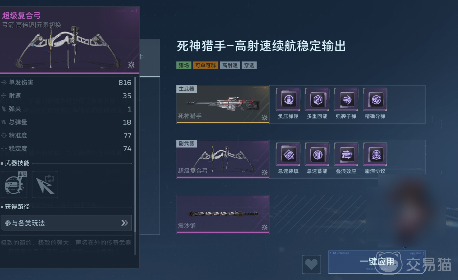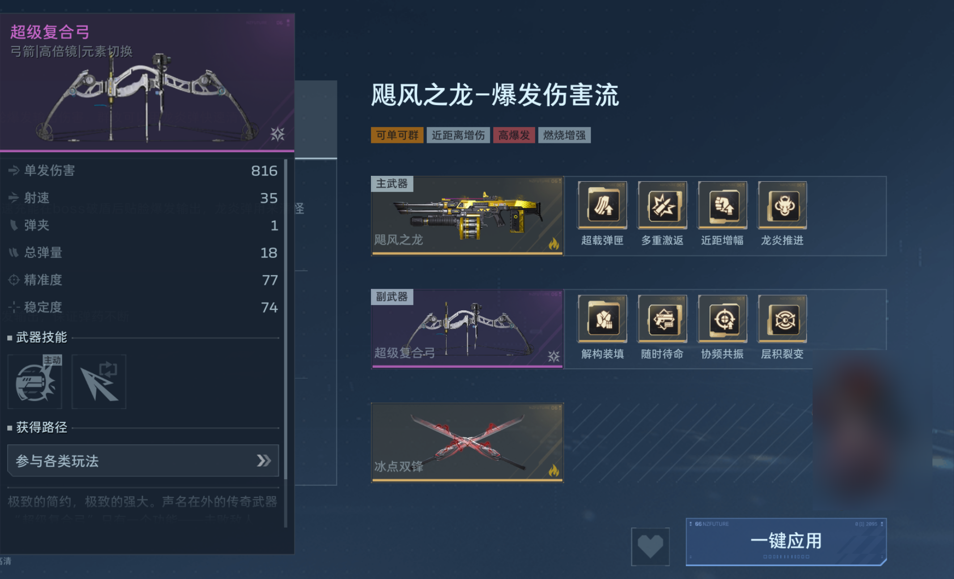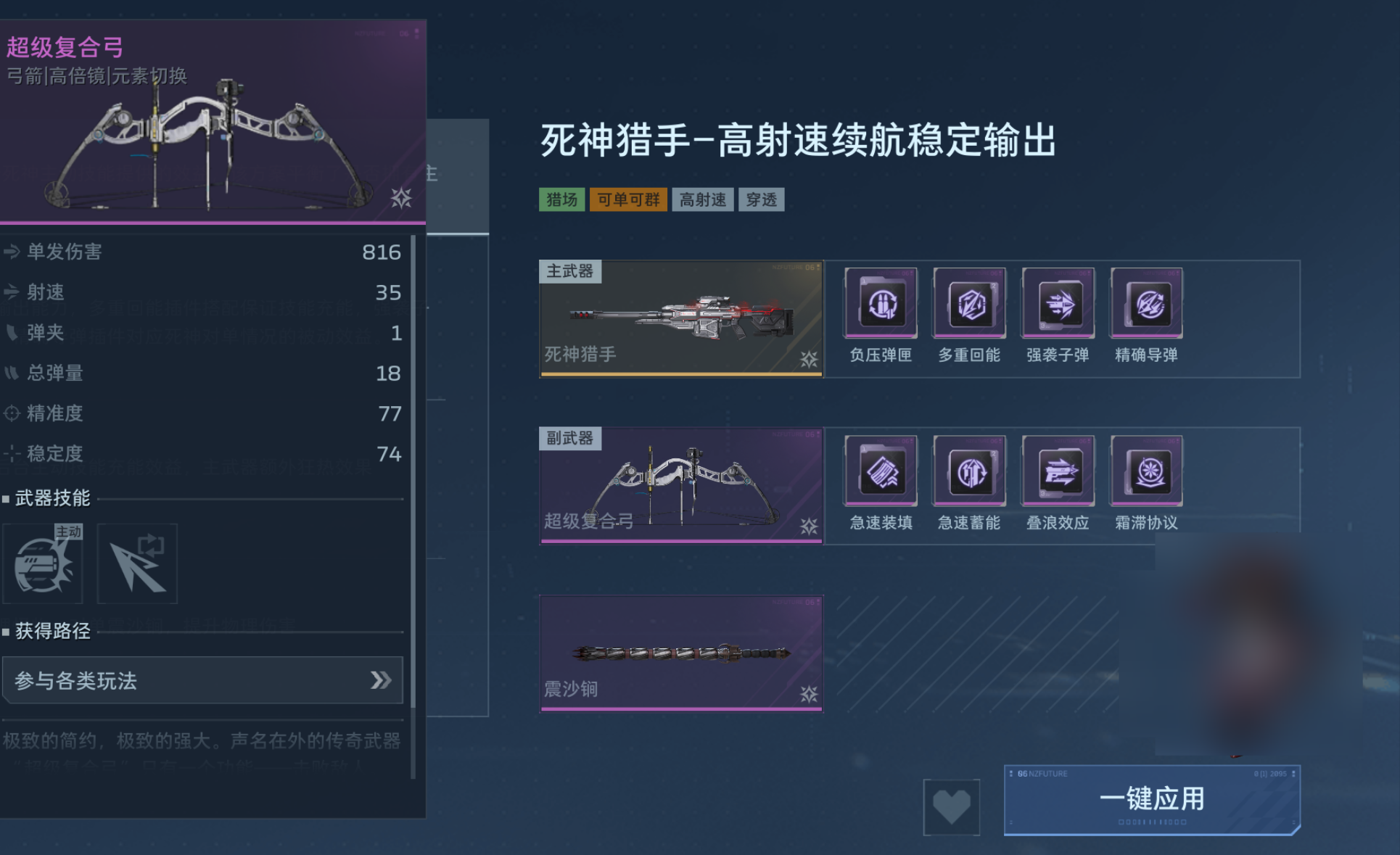 值得注意的是,超级复合弓作为副武器,需与主武器形成互补协同。推荐搭配高爆发或持续压制型主武器,例如本赛季新上线的幽冥毒皇、钢铁轰鸣;亦可沿用高人气配置,如死亡猎手与飓风之龙,以构建均衡的攻防体系。