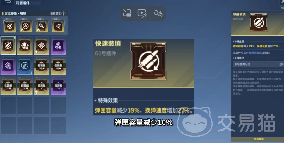 1号插件推荐【快速装填】:该插件虽带来10%弹匣容量削减,但可提升换弹速度27%,显著缩短火力真空期。为弥补容量损失,建议同步装配【续装增量】——每次换弹额外增加2发子弹,形成高效补给闭环。若暂未获取续装增量,可选用【扩容弹匣】作为过渡方案:它提供10%基础弹匣扩容,并附带12%换弹加速,兼顾容错性与节奏稳定性。