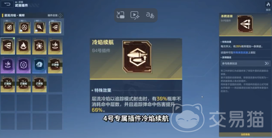 4号插件首选专属【冷焰续航】:在追踪模式下,命中目标时有30%概率不消耗当前层数,同时提升追踪弹60%伤害。该效果极大强化了持续压制能力。若暂未获得专属插件,【杀戮连锁】可作为功能替代——每次开火有20%概率生成额外弹道,增强覆盖密度与命中容错率。