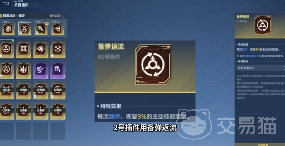 2号插件优先选择【备弹返流】:每次换弹可恢复9%主动技能能量,大幅提升技能循环频率。若尚未解锁该插件,【扩容】是可靠替代项——它不仅将主动技能储存上限+1次,还加快10%充能速率,保障关键技能的稳定释放。