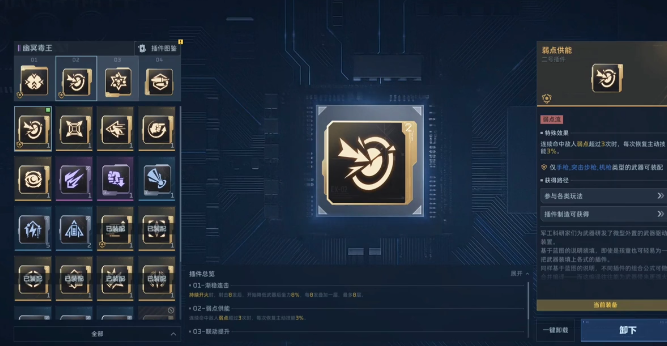 插件组合直接决定幽冥毒王的战场定位。猎场与塔防两种模式需差异化配置:猎场推荐1号插件选择“剑吻连击”,虽不提供直接伤害加成,但可增强控枪精度,并在主动技能释放后额外提升换弹速率,确保输出连贯性;2号插件建议搭配“超频蓄能”,使技能充能速度提升50%,大幅缩短技能冷却间隔;若侧重弱点打击循环,则可启用“弱点反馈”类插件——每命中敌人弱点3次,即恢复3%主动技能能量。副武器过渡期推荐使用“超级复合弓”,其技能激活后可提供30%射速加成,强化衔接效率。