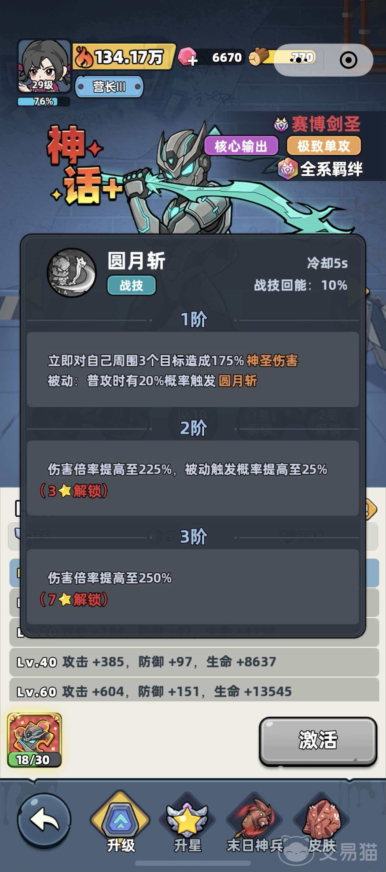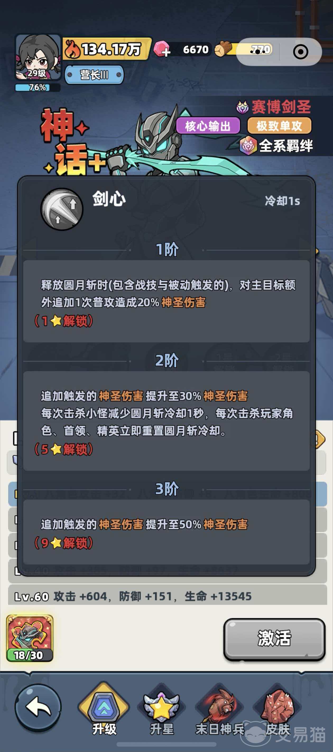 技能机制方面,“圆月斩”为范围物理攻击技能,释放瞬间对自身周围3名敌方单位造成175%神圣伤害;“剑心”则属于被动协同技,当赛博剑圣使用圆月斩或其他战技命中目标后,自动追加一次普攻,额外造成20%神圣伤害。二者形成高频连击节奏,强化了技能循环效率与持续压制能力。