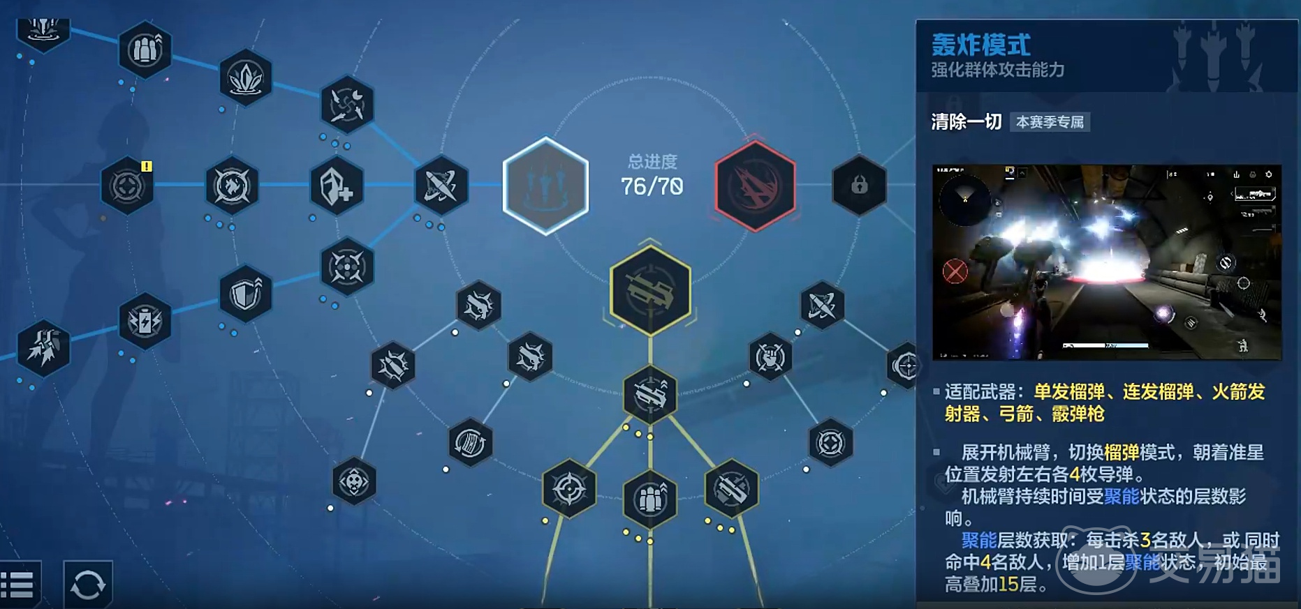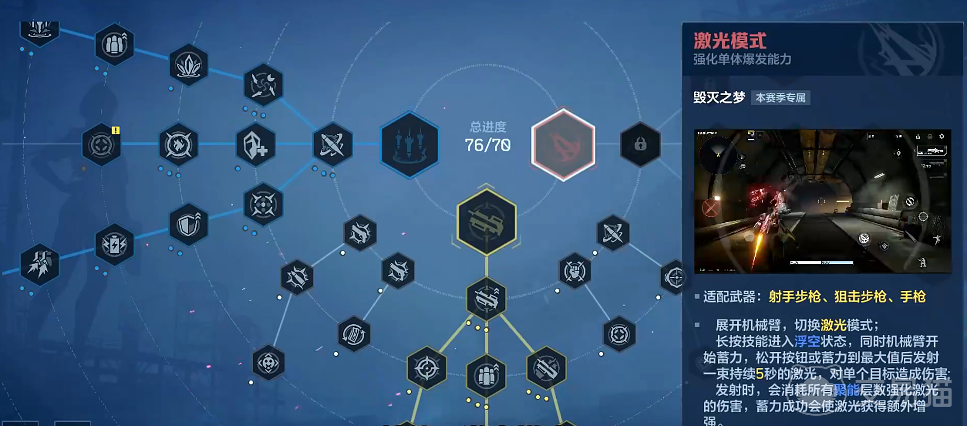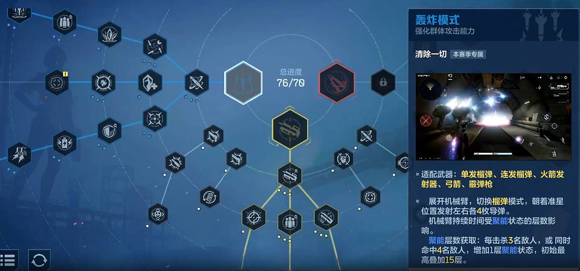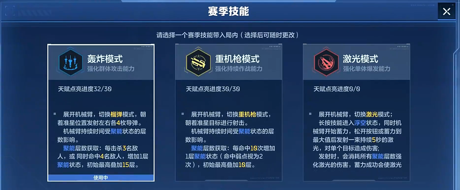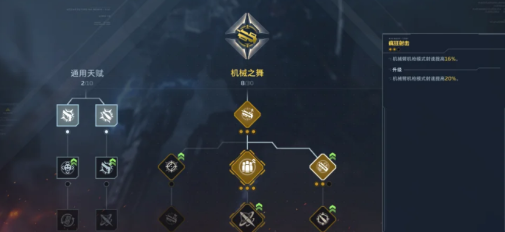 新赛季天赋体系采用双层架构设计:上层为赛季专属天赋,下层为基础通用天赋。赛季天赋划分为三大战术方向——激光模式、重机枪模式与轰炸模式,每条路径均与特定武器类型强绑定,不可跨类型混搭。玩家需依据主力武器类别进行定向投入,避免天赋点分散导致战力稀释。