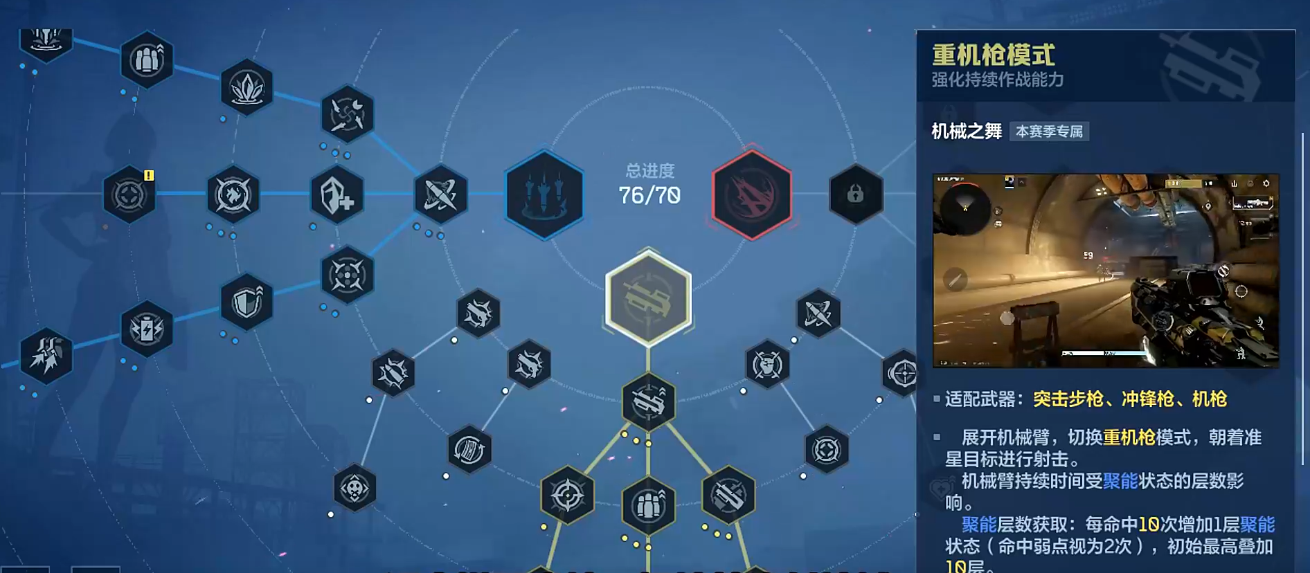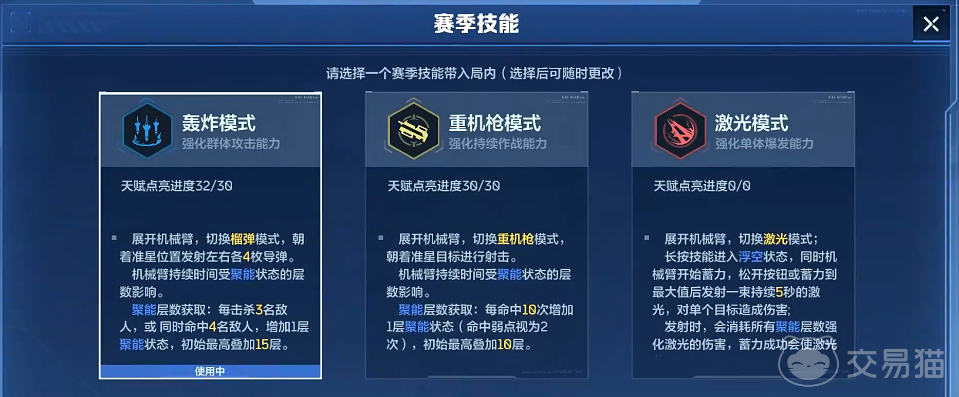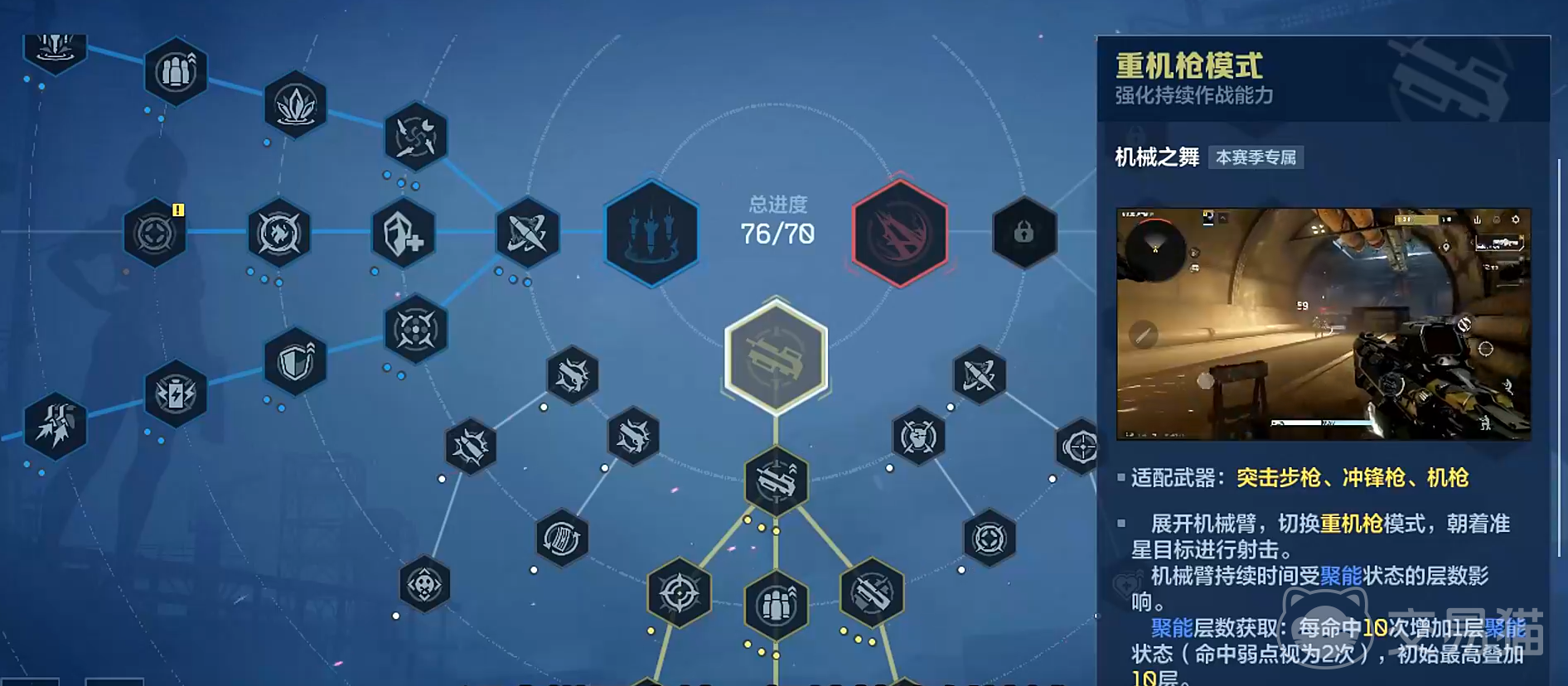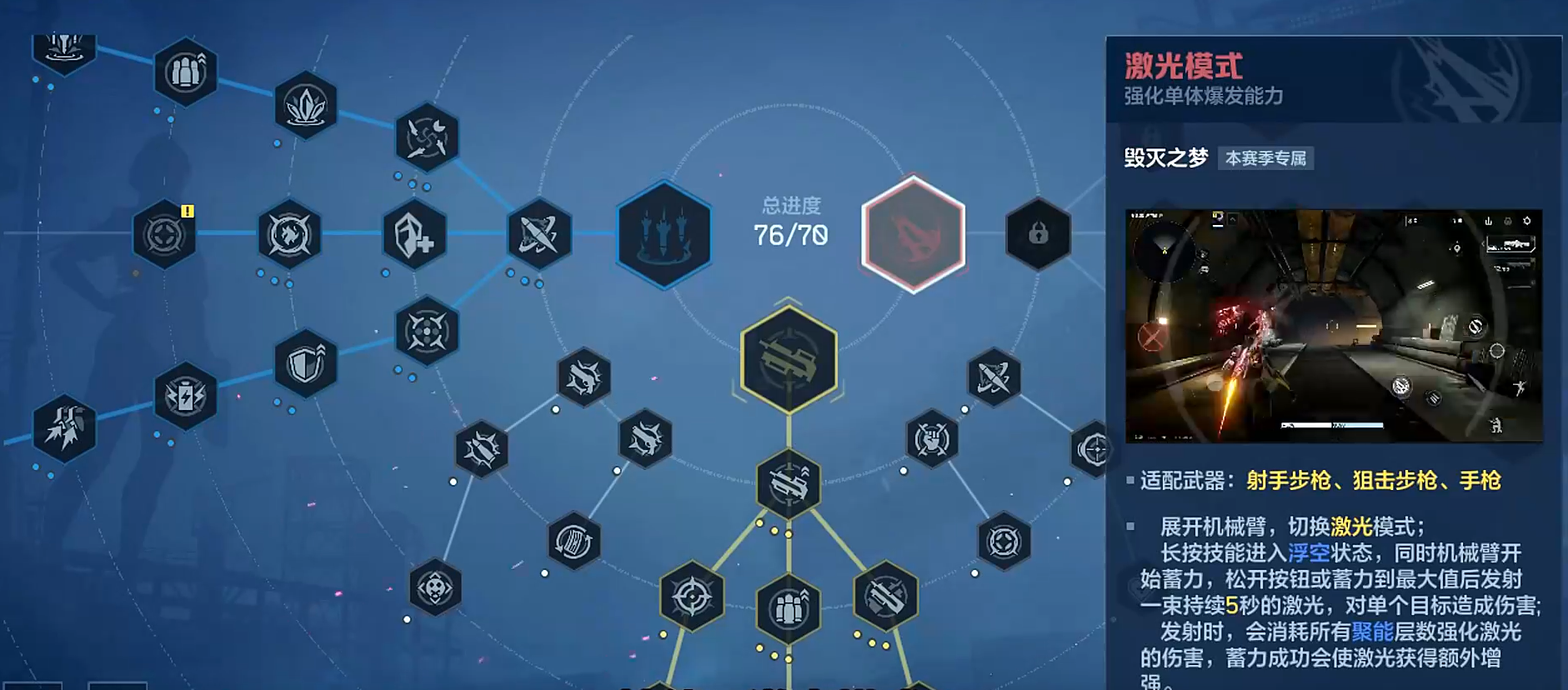 新赛季天赋体系采用双层架构设计:上层为赛季专属天赋,下层为基础通用天赋。赛季天赋划分为三大战术方向——激光模式、重机枪模式与轰炸模式,每条路径均与特定武器类型强绑定,不可跨类型混搭。玩家需依据主力武器类别进行定向投入,避免天赋点分散导致战力稀释。