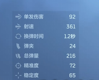 苔色暴风虽归类为低倍镜副武器,但性能远超常规手枪水准。其单发伤害固定为92点,射速达361发/分钟,换弹仅需1.2秒,弹匣容量24发,总携弹量216发;精准度72、稳定性65,各项参数均处于同类型武器前列,尤其适合需要快速反应与近距压制的战斗节奏。