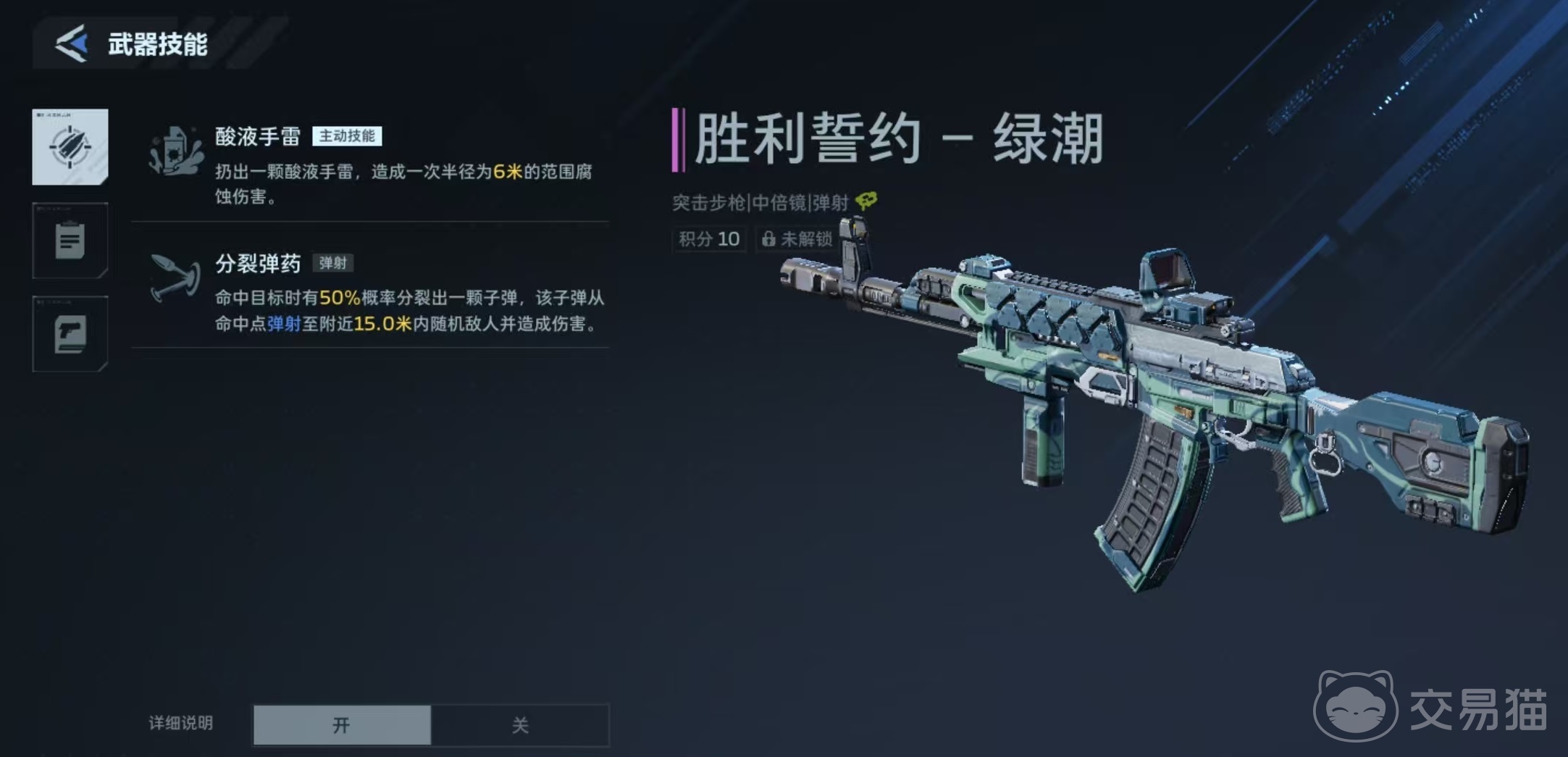 就武器本体而言,“胜利誓约·绿潮”与标准版“胜利誓约”共享全部战斗参数:归类为突击步枪,支持中倍率光学瞄具启用;基础单发伤害为65点,理论射速500 RPM,弹匣容量38发,总携弹量646发,精准度74,稳定度68。整枪采用重工铸造工艺打造,融合飓风经典设计语言,在视觉呈现与握持反馈之间达成高度协调。技能配置方面,主动技能为“酸液手雷”,投掷后生成半径6米范围腐蚀伤害区域;被动技能“分裂弹药”可在命中目标时,以50%概率触发一次弹道分裂,新弹头将在15米范围内自动索敌并造成全额伤害(无衰减)。