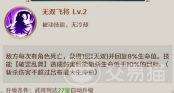 吕布的绝学侧重爆发与统治级战场控制。“无双”状态与“阵亡强化”机制可叠加生效,显著提升攻击力、暴击率与生存阈值。该组合使其在短时间内的输出密度与容错能力远超常规武将,尤其适合关键节点的逆转与收割。