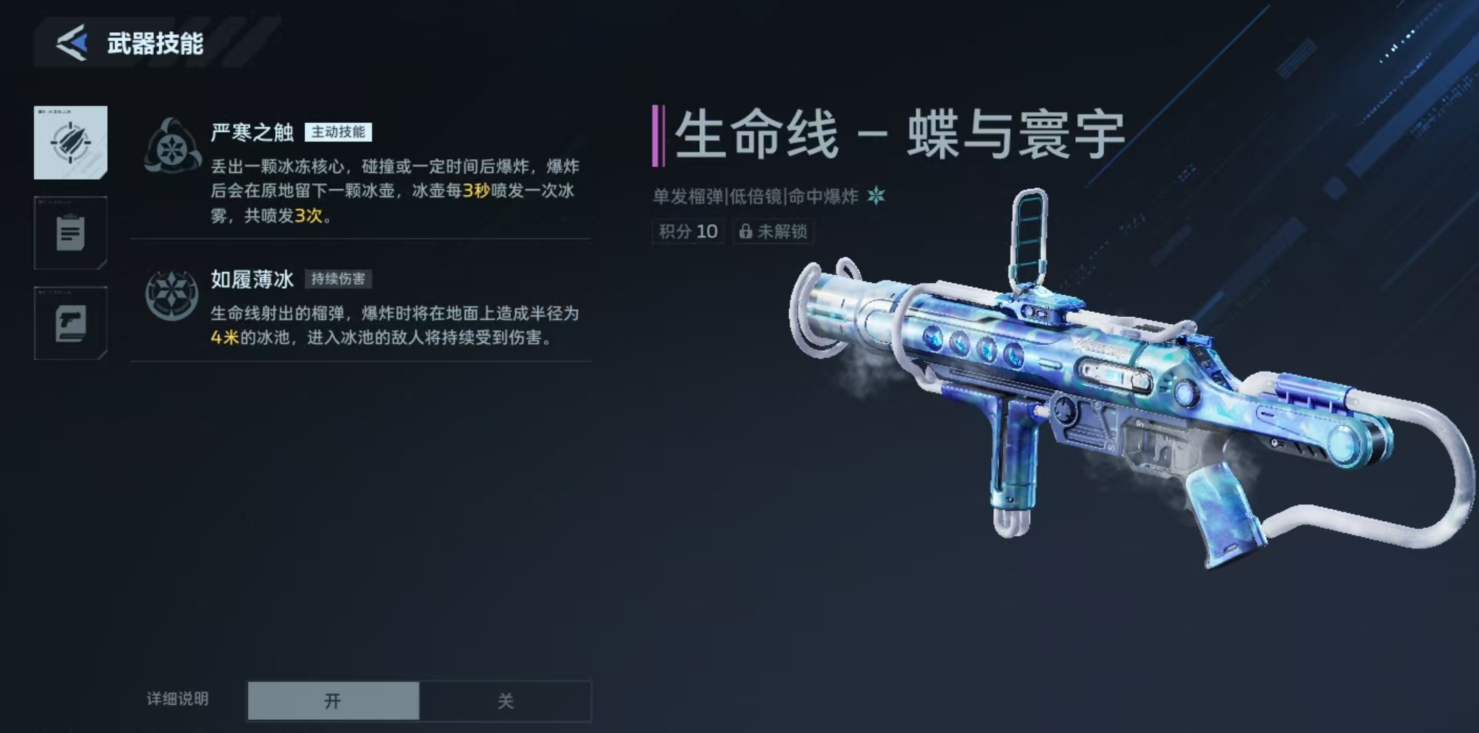 实战层面,“生命线”延续高爆发特性:爆炸半径2.5米,适用于中近距离集群目标清除。技能配置方面,主动技能“严寒之触”投掷一枚冰冻核心,命中或延迟后引爆,生成可持续3次、每3秒喷发一次冰雾的冰壶;被动技能“如履薄冰”使每次爆炸在地面形成直径4米的冰霜区域,范围内敌人将持续承受伤害。双技能协同下,该武器在压制推进、区域封锁及多目标牵制场景中表现突出。