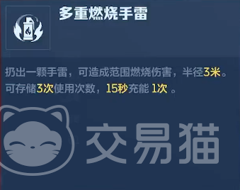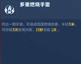 基础参数方面,该武器单发伤害为62点,理论射速500 RPM,弹匣容量50发,总携弹量650发,精准度68%,稳定性61%。其主动技能为“多重燃烧手雷”,最多可储备3枚,充能周期为15秒/次。每枚手雷落地后触发半径3米的持续燃烧区域,对范围内目标造成多段灼烧伤害,兼具战术封锁与小范围清场双重功能,特别适用于转角压制、掩体驱离及狭窄通道控场。