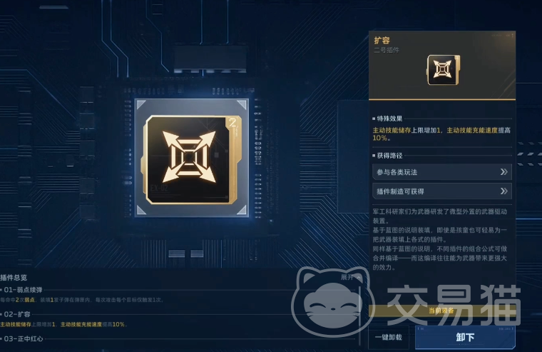 第二插件需按战术定位二选一:若侧重节奏掌控与高频技能释放,推荐【多重激返】,可大幅缩短主动技能冷却;若倾向稳扎稳打、提升容错率,则选用【扩容】,使主动技能储备上限提升至两次,实现更灵活的爆发窗口分配。