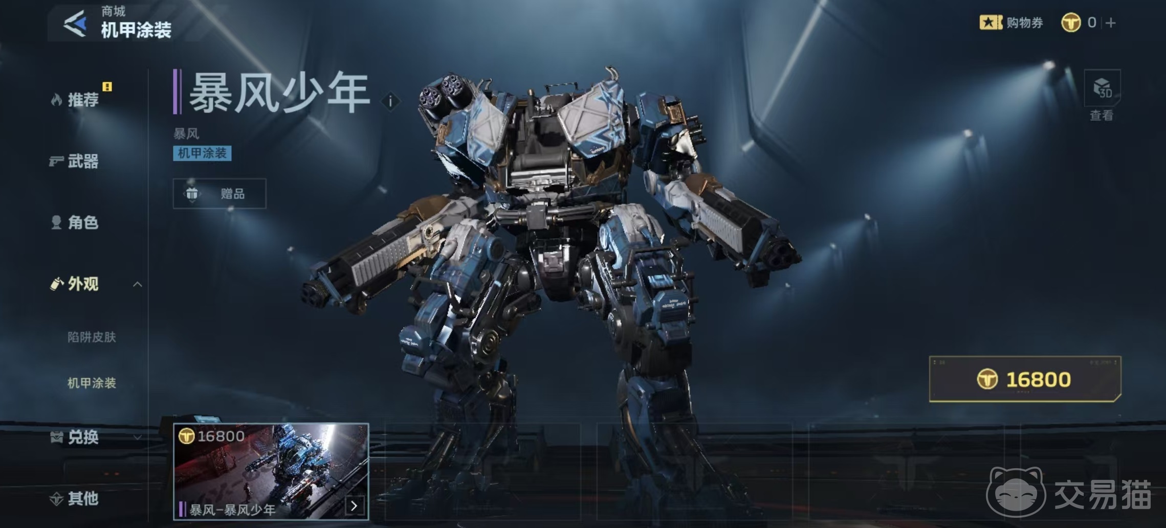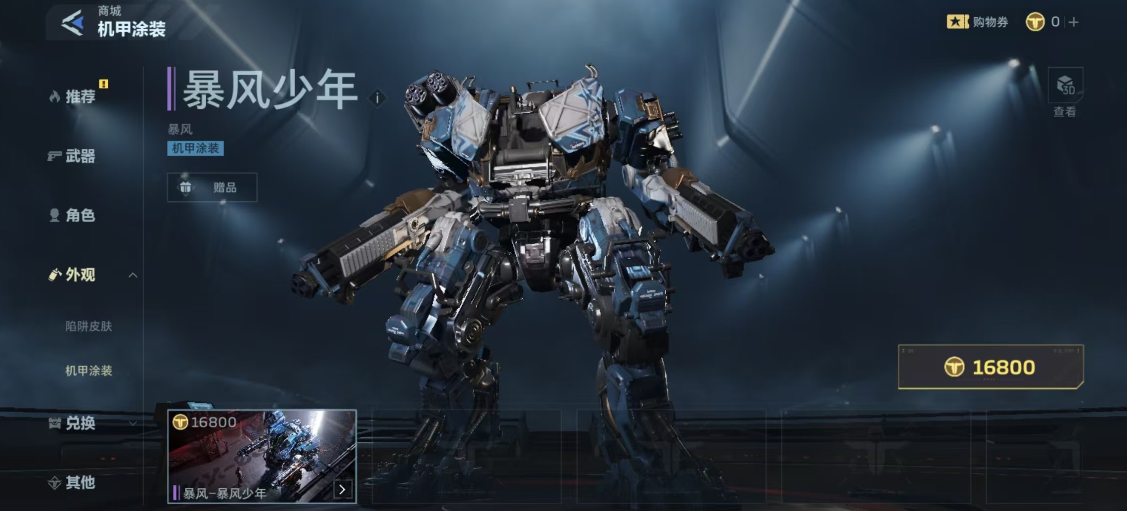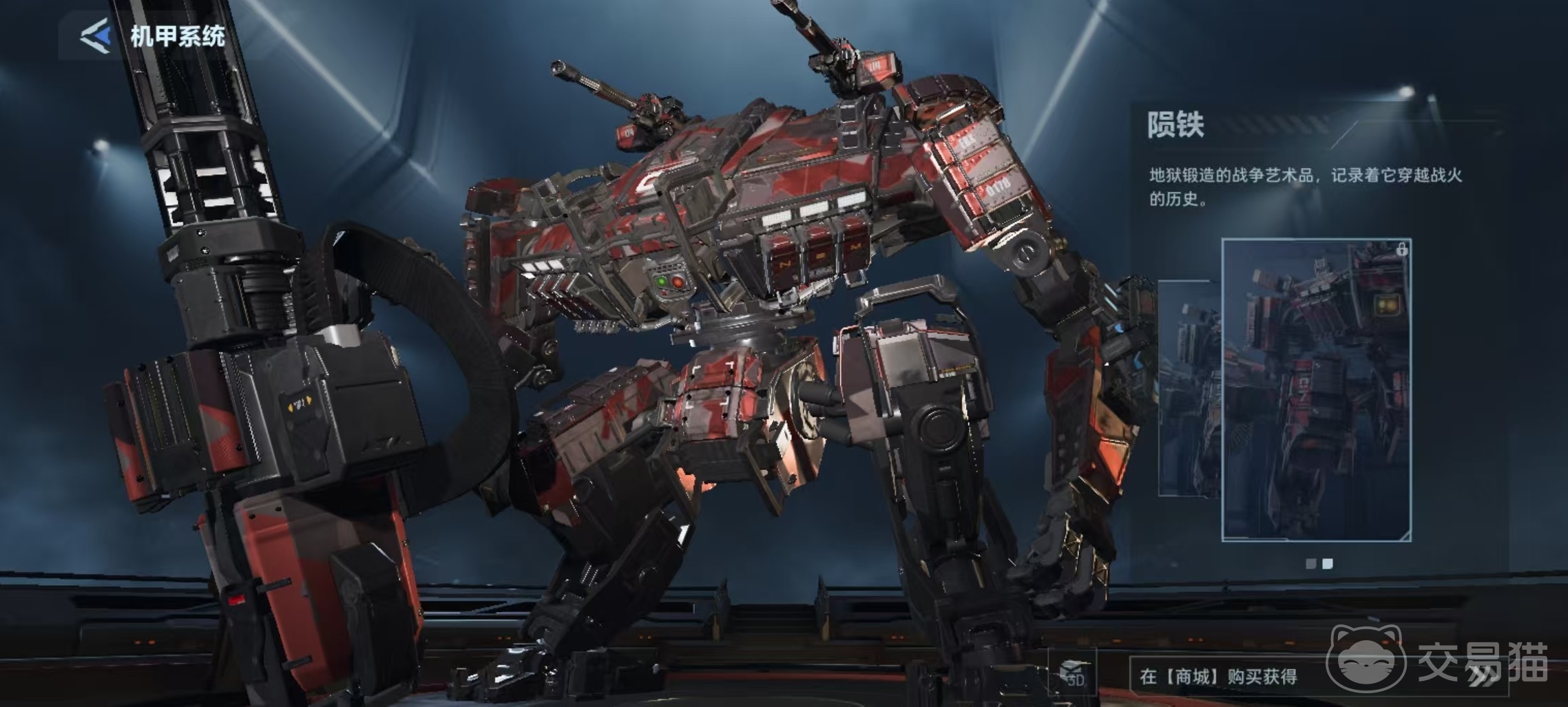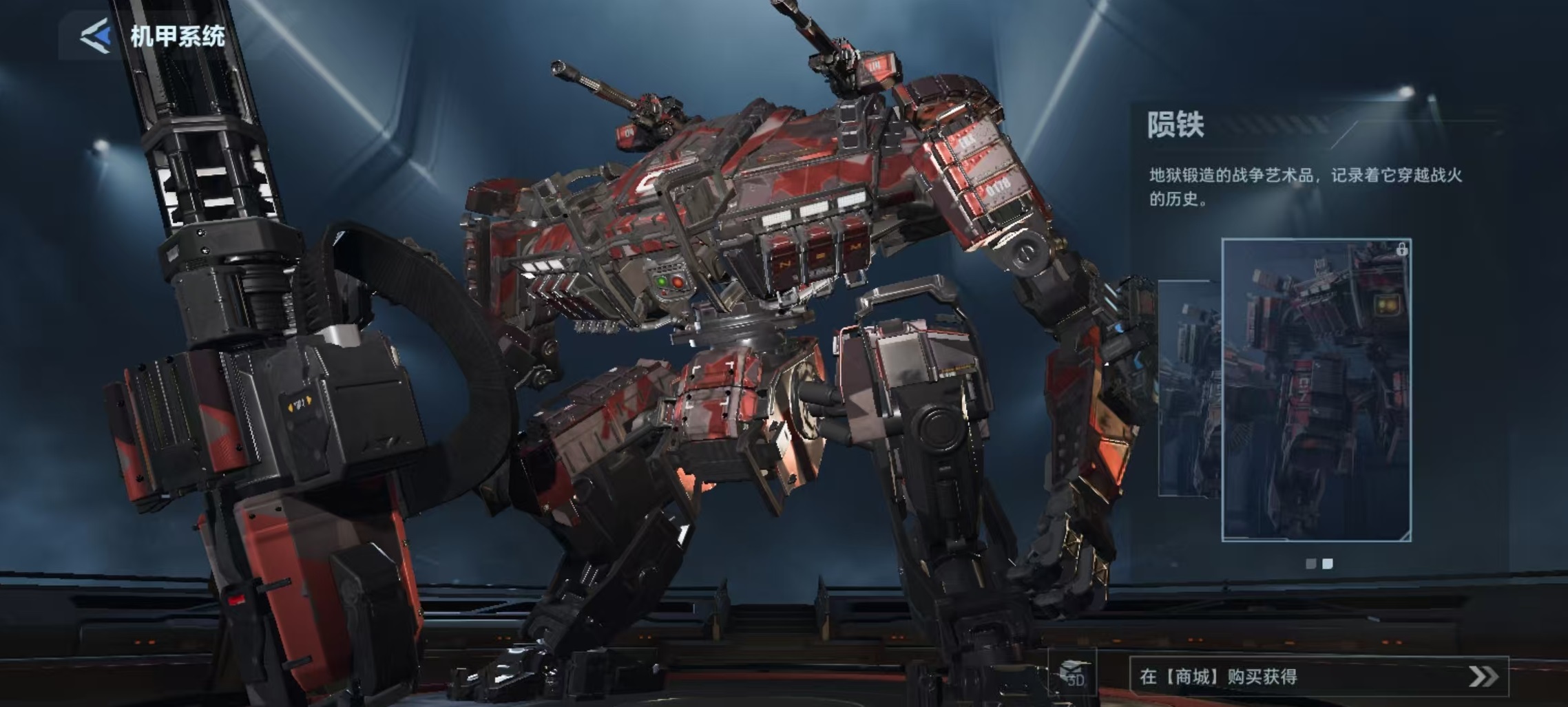 需注意的是,当前版本中该涂装尚未正式上线商城,具体售价暂未公布。但参考同系列另一款机甲涂装“暴风少年”的定价(16800 NV点),可合理预估“陨铁”涂装价格区间与其基本持平。待上架后,玩家可在机甲界面中点击对应选项完成外观切换,装备后将在战斗中实时呈现完整视觉效果。