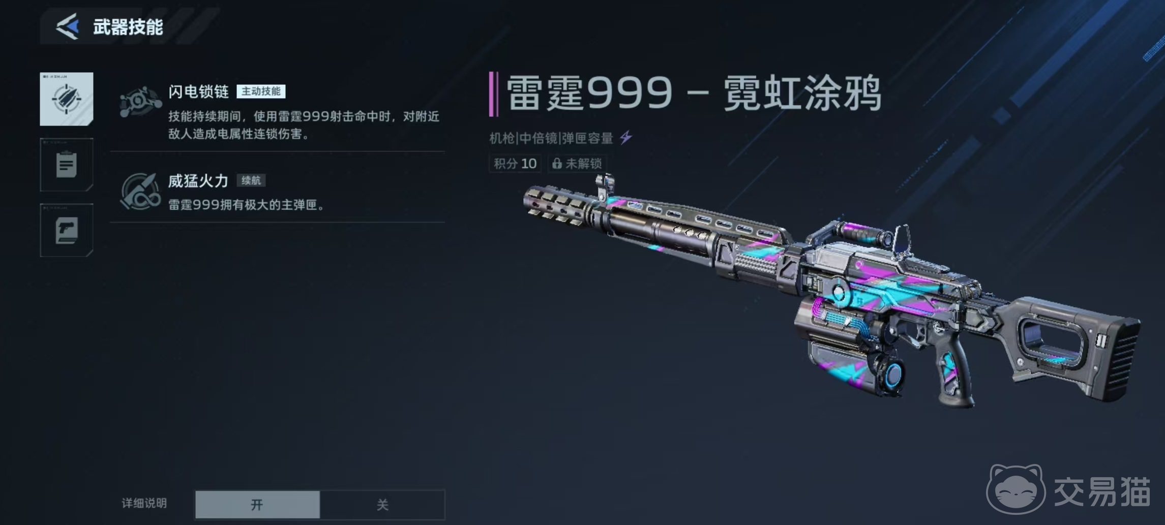 雷霆999的基础性能参数如下:单发伤害47,射速621,弱点伤害加成130%,总弹量999,精准度78,稳定度55。其核心技能“连锁闪电”可在技能生效期间,使每次命中触发电属性范围连锁伤害,大幅强化清怪效率。凭借超大弹容与持续压制能力,该武器被广泛视为平民玩家PVE开荒阶段的T0级选择。后续还可通过装配扩容弹夹、川流不息、渐入佳境、技能扩散等插件进一步提升实战强度,实现更高层次的副本攻坚与伤害输出表现。