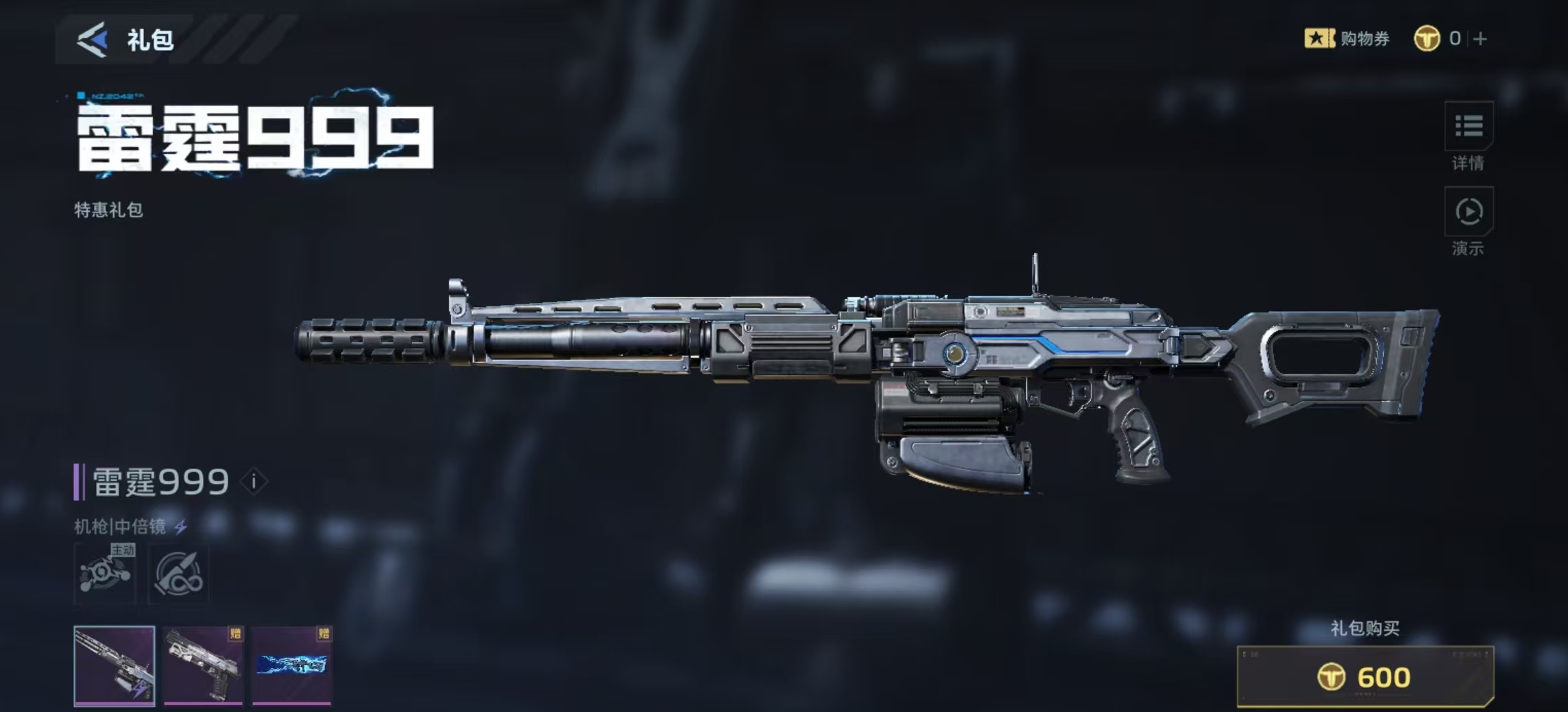 在皮肤尚未开放期间,玩家仍可通过商城直接入手雷霆999本体。当前售价为600点NZ点,对应礼包除包含雷霆999主武器外,还附赠雷霆之影手枪及电光火石名片,综合性价比突出,是现阶段快速组建高输出配置的优选方案。