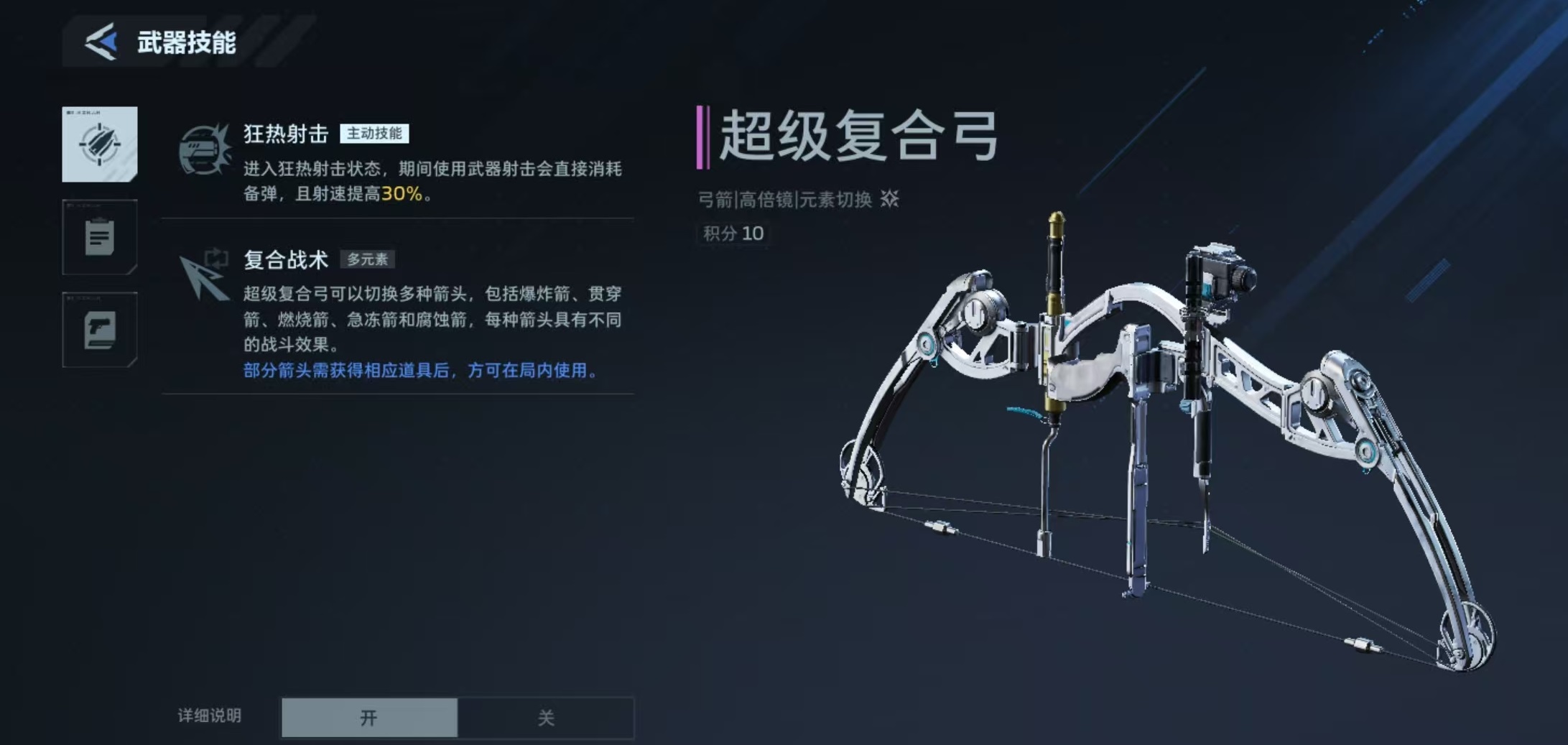 超级复合弓则以模块化战术扩展见长。其主动技能“狂热射击状态”在激活时,射击将直接消耗备弹,并提升30%射速;真正区别于其他弓箭的是其箭头切换系统——支持装配爆炸箭、贯穿箭等多种功能型箭头。爆炸箭适用于密集目标区域清场,贯穿箭可实现多目标穿透打击,不同箭头还可根据主武器类型或地图结构进行动态调整,显著提升应对复杂战局的灵活性与容错率。