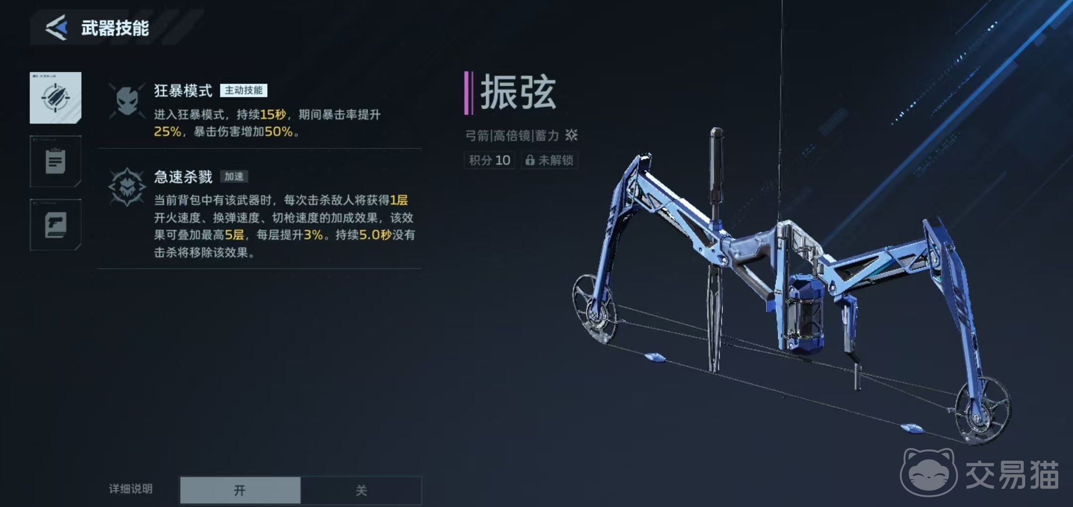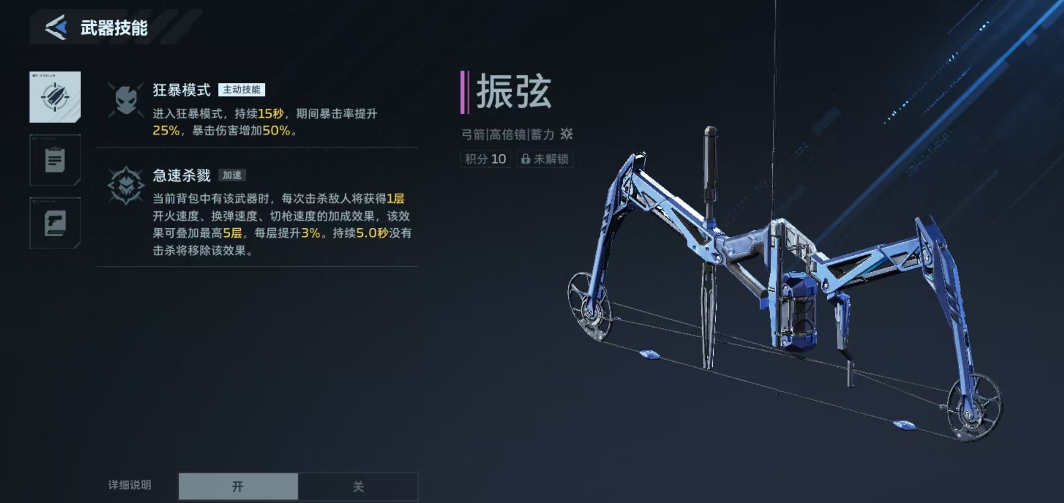 振弦的核心优势在于持续作战加成体系。其主动技能“狂暴模式”可持续15秒,期间提升25%暴击率与50%暴击伤害;被动效果则体现为“背包增益”:只要该武器存在于背包中,每次击杀敌人即可叠加一层增益,提升开火速度、换弹速度及切枪速度,最多可叠加至15层;若5.0秒内未达成击杀,则层数自动清空。这意味着即使不主动使用振弦,它也能为整套战斗节奏提供隐性支持。