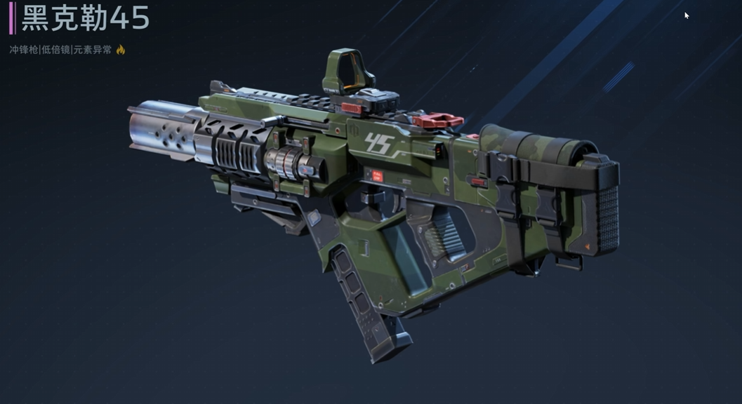 第二款为“黑客勤45”,属性为火系。该枪具备主动投掷燃烧手雷能力,可对指定区域内的敌人造成持续火焰伤害;其被动技能聚焦资源协同——每次命中目标,均可为后台其他武器积累充能进度,支持多武器间能量联动。整体射击稳定性出色,适合需要频繁切换武器、强调节奏控制的战术流派。