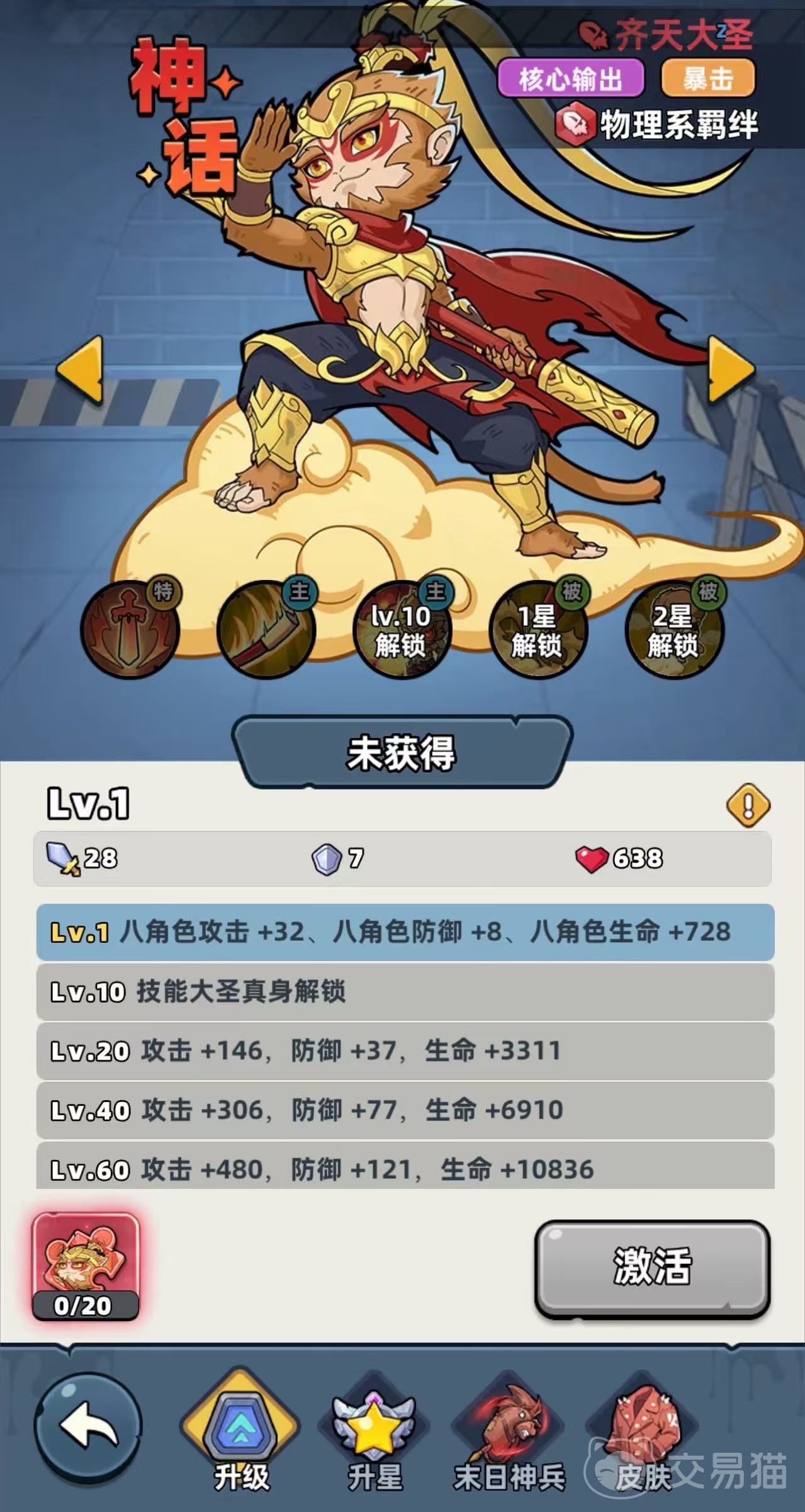 第二顺位推荐为连续登录第7天免费领取的齐天大圣。该角色为纯物理爆发流派代表,无需额外付费即可稳定获得。核心机制围绕暴击率与总伤增益展开:基础被动提升全伤害并强化暴击概率;技能组以高速连段棍击为主,单次命中伤害越高,后续连击收益越显著;大招触发“斗战胜佛”变身状态,期间暴击率与基础伤害同步大幅提升;其余技能均基于金箍棒释放,含范围物理伤害及可控击飞效果;当星级升至二星后,还可召唤猴群协同作战,提供可观的辅助压制能力。