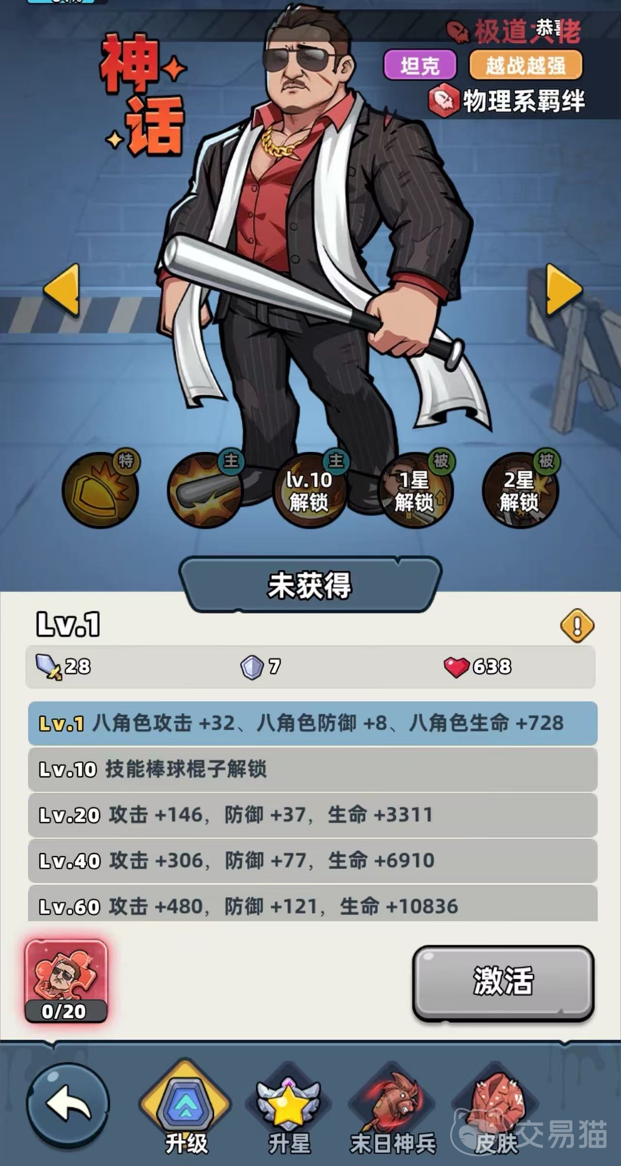 其余神话英雄需通过游戏内“电台招募”系统获取。当前阶段建议优先抽取“极道大佬”,以补强队伍前排承伤能力。该角色兼具坦克与近战输出双重属性,成长后可叠加高额攻击力、防御力与生命值;技能提供显著免伤比例,并附带格挡判定;位移技能可快速贴近目标施放控制性闷棍;大招挥舞棒球棍造成大范围物理伤害,同时击退敌人并永久提升自身物理攻击,是中期攻坚与持久战的核心支点。