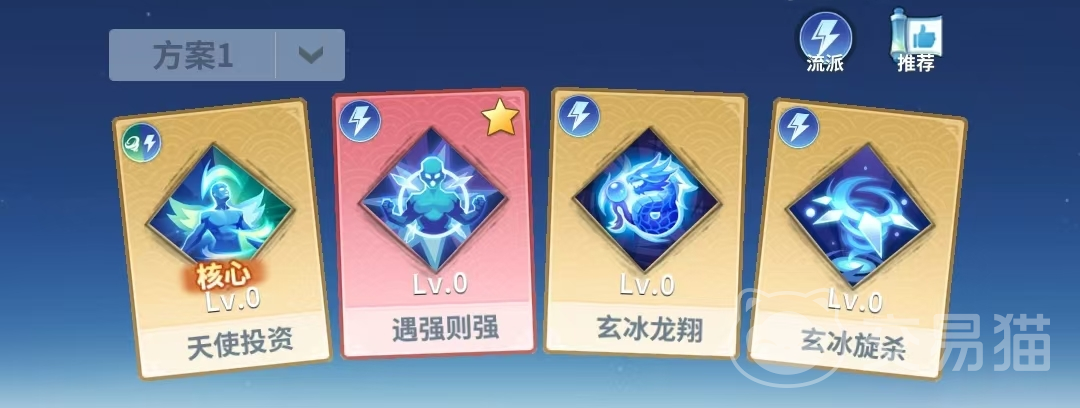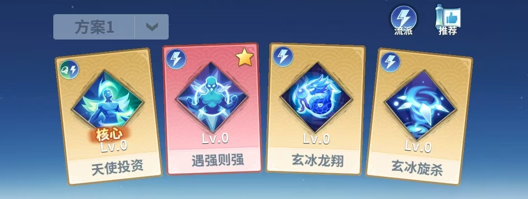 配置解析:以冰冻控制为核心,辅以属性强化的战术体系。【遇强则强】将【天使投资】增益完全导向自身,显著提升属性成长效率;【玄冰龙翔】与【玄冰旋杀】兼具范围冰冻与群体伤害,形成控制—输出—再控制的循环节奏。适用于需要打断连续施法或冻结高威胁单位的战斗情境。